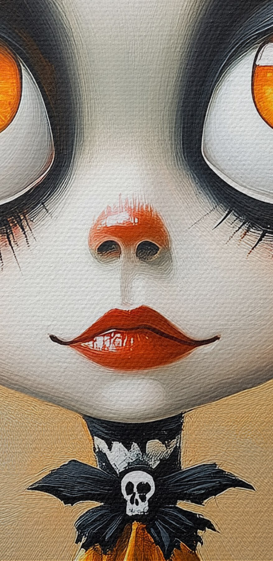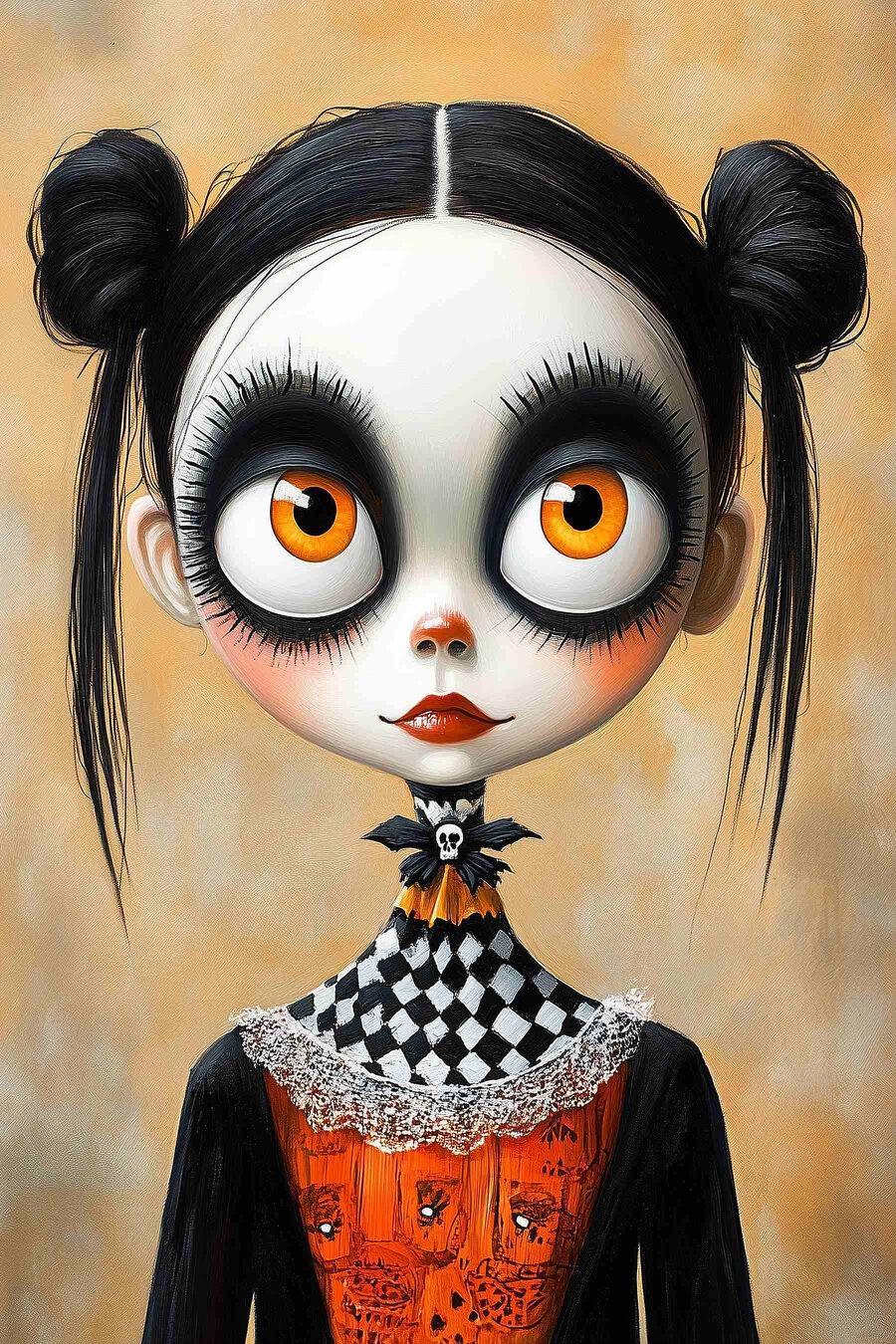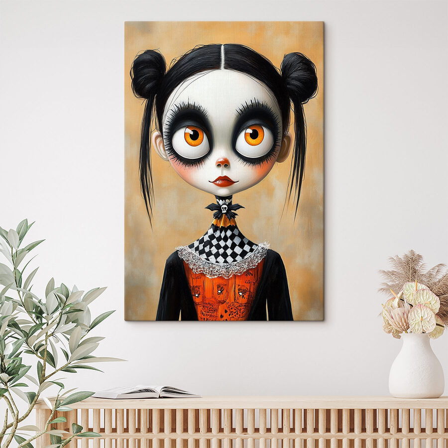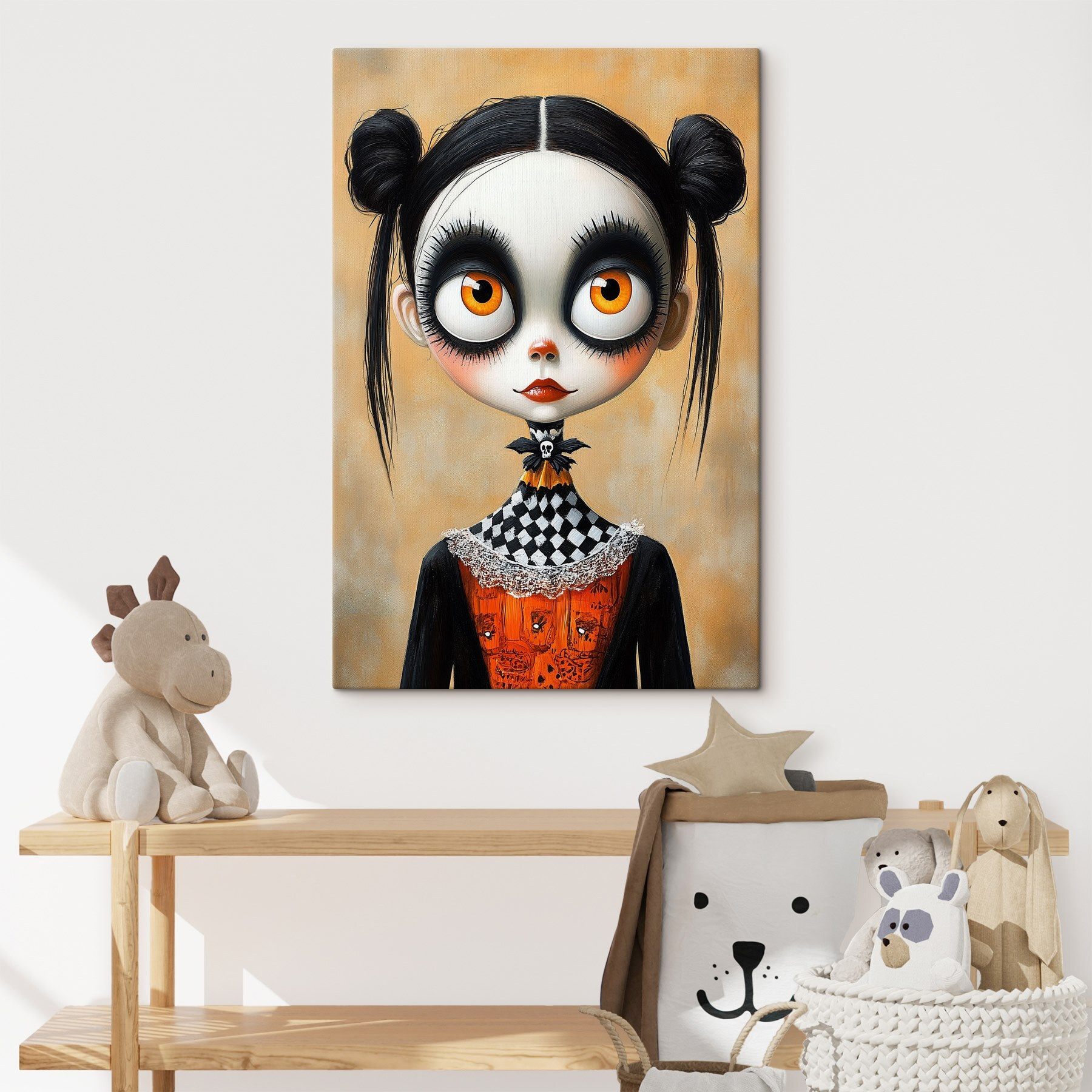 Poznaj wydruk na płótnie “Cartoon Girl with Big Eyes” – zachwycającą szczyptę kaprysu na każdą ścianę. Ta dziwaczna postać z dużymi oczami zdaje się zaglądać w twoją duszę, wzbudzając ciekawość i rozbawienie. Wyobraź sobie, że wisi w twoim salonie lub przestrzeni artystycznej – z pewnością rozkręci rozmowę! Te wyraziste oczy, otoczone uderzającą czernią i pomarańczą, tańczą z zabawną tajemnicą. To jak posiadanie cichego, wiecznie ciekawskiego przyjaciela, który zawsze jest w nastroju na odrobinę halloweenowej zabawy. Zabierz ją do domu i daj się oczarować!