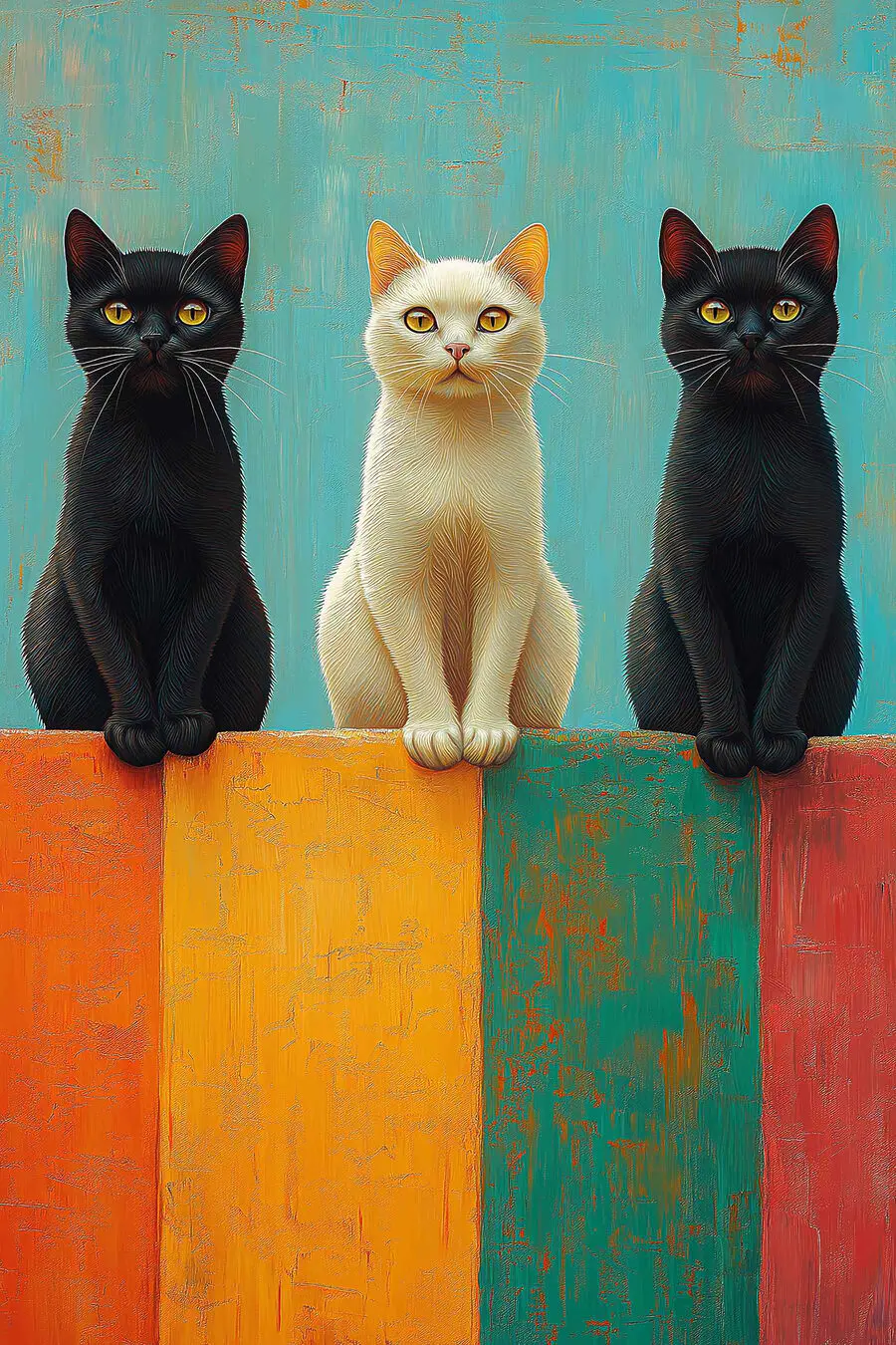 Wyobraź sobie: trio kotów pozujących na kolorowej ścianie, gotowych dodać odrobinę kaprysu do Twojego pokoju. Ten druk na płótnie to nie tylko koty – choć są niezaprzeczalnie urocze – ale także plusk żywych kolorów, jak zaproszenie do ożywienia nawet najnudniejszego dnia. Idealny dla każdego, kto kiedykolwiek cieszył się leniwym popołudniem obserwując koty (lub chciałby to zrobić). To tak, jakby były gotowe podzielić się sekretem – może o panowaniu nad światem? Powieś go i pozwól, by ich ciche miauczenie rozjaśniło Twoją przestrzeń.