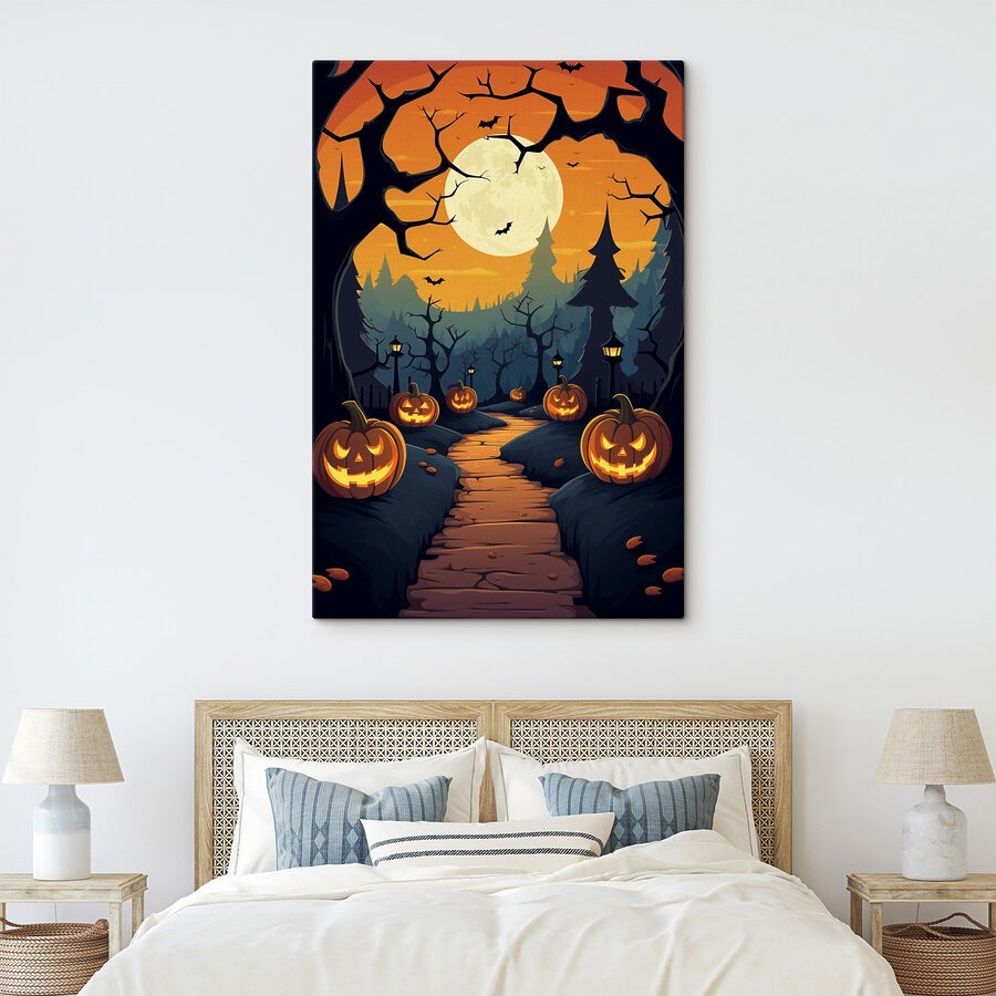 Wyobraź sobie spacer kapryśną ścieżką obsypaną dyniami i drzewami, prowadzoną przez psotny księżyc. Ten uroczy obraz na płótnie bez trudu oddaje figlarnego ducha jesiennej nocy. Idealny do dodania szczypty tajemniczości do domu, jest jak wejście do bajki, w której każdy zakątek może kryć nową przygodę. Idealny dla miłośników przyrody lub każdego, kto lubi odrobinę magii w swoim wystroju. Zawieś go i pozwól, aby czar rozpoczął swój taniec w twoim salonie – nie jest wymagana różdżka!