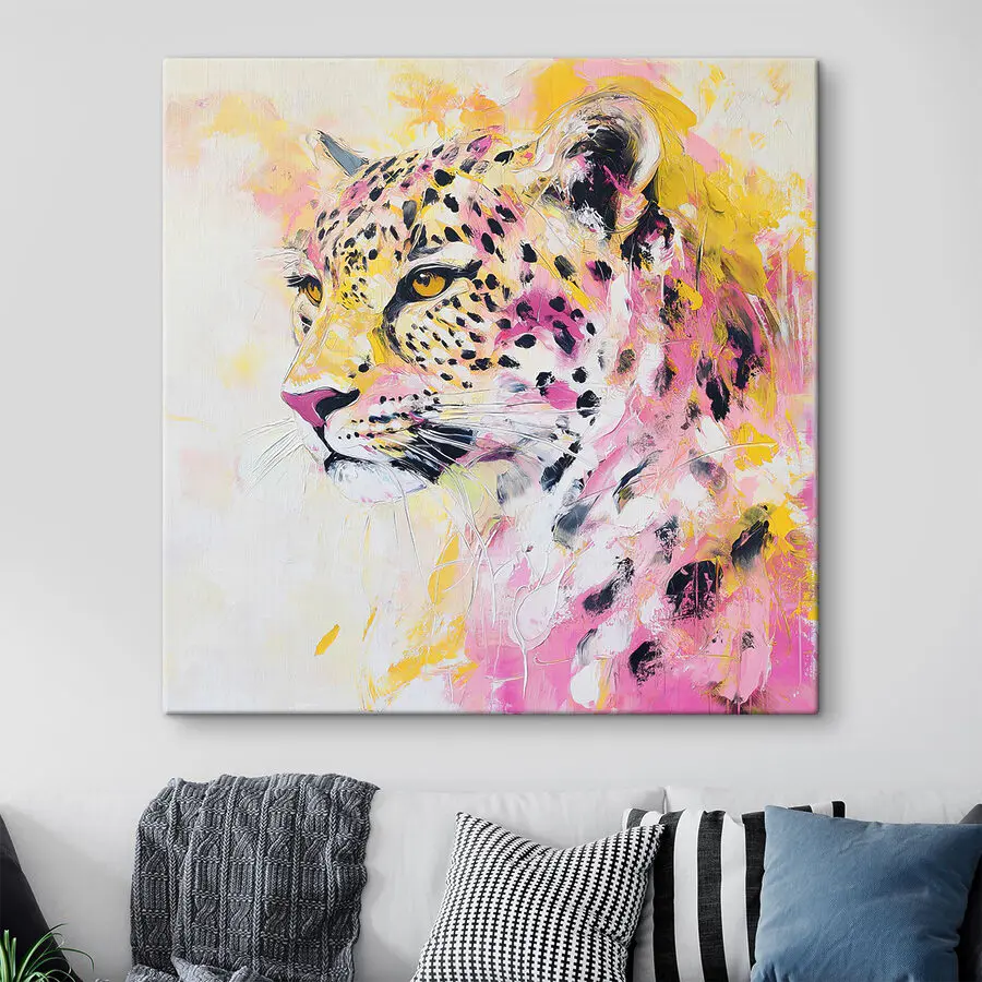 Ten żywy wydruk na płótnie przedstawiający geparda jest jak odrobina dzikiego koloru w Twoim pokoju. Przyciąga wzrok, prawda? Mieszanka odważnych żółci i różów – prawie tak, jakby gepard spędzał dzień w spa – wnosi abstrakcyjny akcent do jego zadziornej elegancji. Wyobraź sobie, że wchodzisz do swojego salonu; czujesz się, jakby ten wielki kot był twoim wyluzowanym współlokatorem, cicho motywując cię do bycia odważnym i wolnym duchem. Idealny dla każdego, kto kocha sztukę, która robi wrażenie, ale nie traktuje siebie zbyt poważnie!