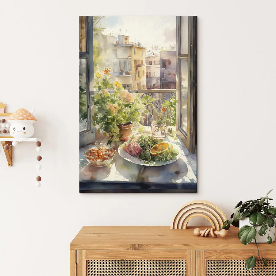 Wyobraź to sobie: Wchodzisz do pokoju, a tam jest – żywe akwarelowe płótno, które jest jak powiew świeżego powietrza. Słoneczny stół zastawiony pysznym jedzeniem i jasnymi kwiatami, wszystko szepczące o spokojnych porankach. Z okna roztacza się widok na urokliwe dachy skąpane w słońcu, jakby zapraszając do pozostania tu na dłużej. To piękna ucieczka wprost na twoją ścianę. Idealny dla każdego, kto marzy o porankach wypełnionych powolnymi śniadaniami i ciepłym światłem dziennym. Dodaj go do swojej przestrzeni i pozwól mu skraść show.