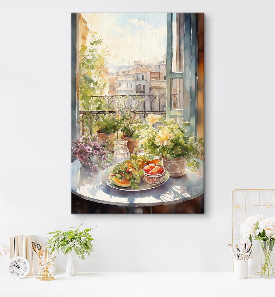 Wyobraź sobie: leniwy niedzielny poranek z kawą i tym żywym płótnem na ścianie. To jak wejście do uroczej małej kawiarni, gdzie światło słoneczne wpada przez okno na stół pełen akwarelowych kwiatów i owoców. Idealny do tchnięcia życia i koloru w każde pomieszczenie – pomyśl o nim jak o mini ucieczce za każdym razem, gdy spojrzysz w jego stronę. Detale są niemal dotykalne, jakbyś mógł zerwać soczysty owoc prosto z talerza. Z pewnością zachęci do rozmowy, rozbudzając marzenia o przytulnych popołudniach i artystycznych przygodach.