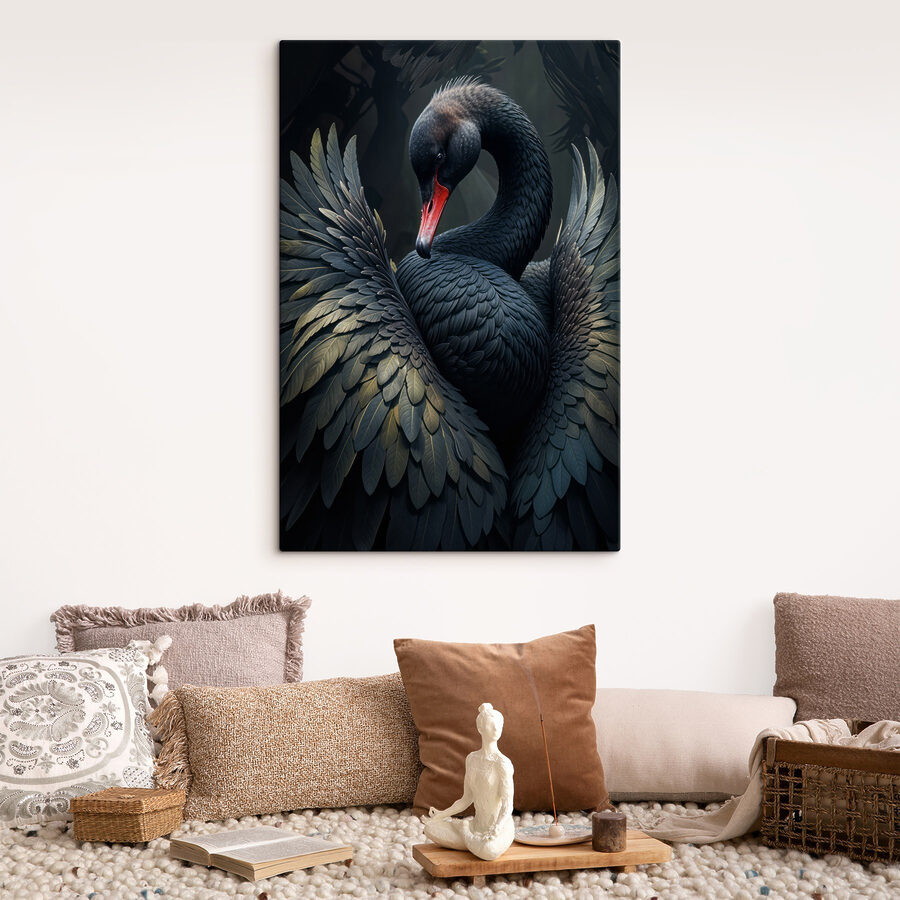 Odmień swoją przestrzeń dzięki oszałamiającemu obrazowi “Obraz Black Swan with a Red Beak”. Ten obraz to nie tylko dekoracja, to oświadczenie. Wyobraź to sobie: piękny czarny łabędź z odważnym czerwonym dziobem, wdzięcznie pozujący wśród liściastych tekstur, które wydają się ożywać. To tak, jakby zapraszał cię na rozmowę o elegancji natury.