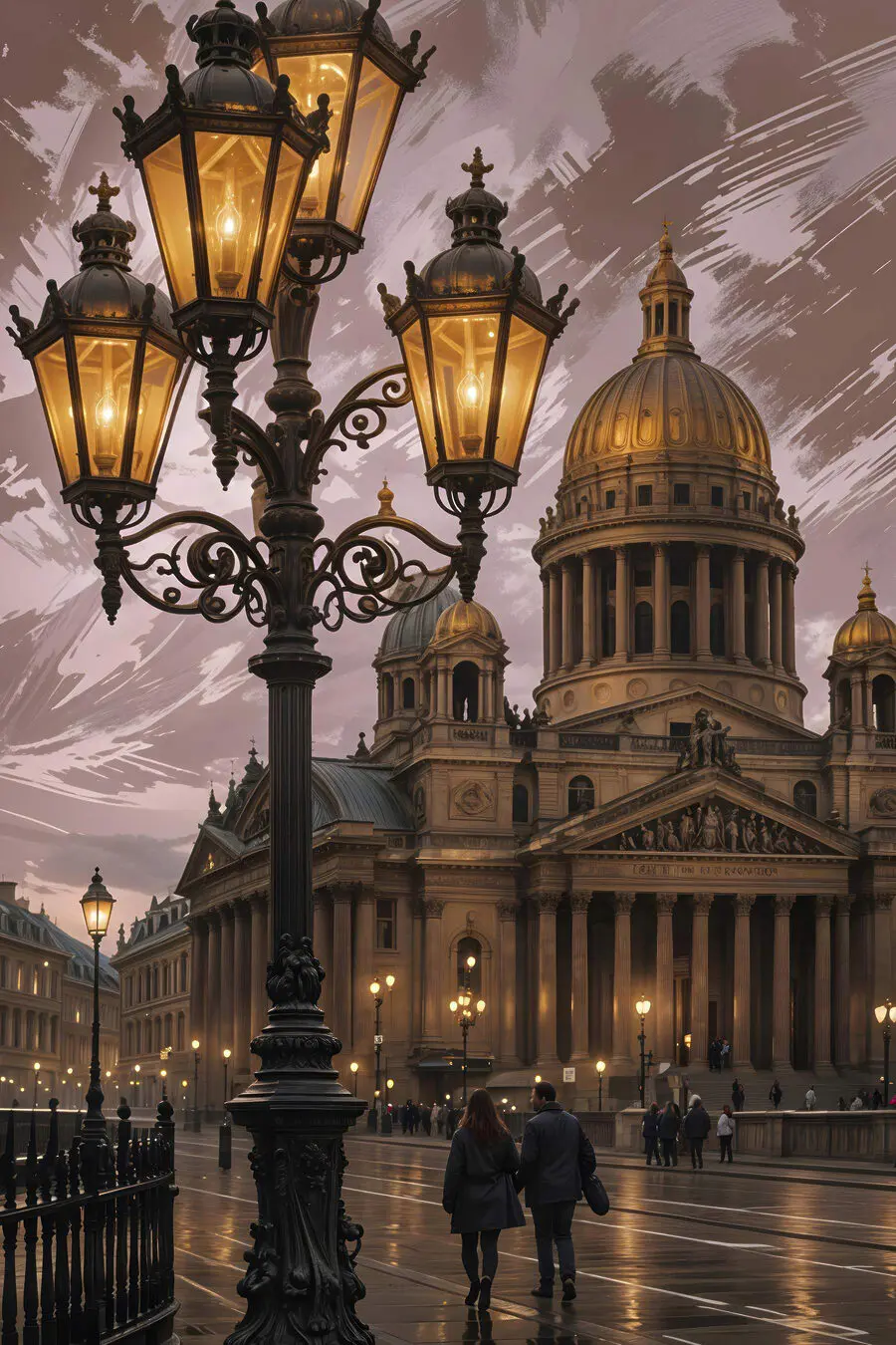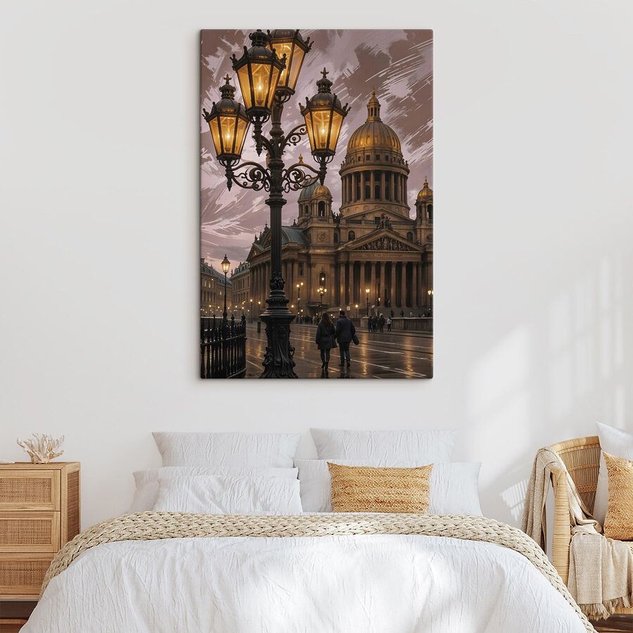 Wyobraź sobie przytulny wieczór, w którym niebo ma senny fioletowy odcień. Ten wydruk na płótnie przedstawia oszałamiający budynek z wielką kopułą i eleganckimi kolumnami, doskonale oświetlony przez delikatne lampy uliczne. To nie tylko dzieło sztuki; to jak okno na tętniące życiem miasto pełne historii. Wyobraź sobie przyjaciół przechadzających się obok, dzielących się śmiechem, a może parę prowadzącą jedną z tych serdecznych rozmów. Ta grafika dodaje odrobinę wyrafinowania do każdej przestrzeni, zachęcając ludzi do pozostania nieco dłużej. To architektoniczny urok otulony ciepłym blaskiem, przekształcający ściany we wspomnienia. Idealny dla każdego, kto kocha odrobinę magii miasta!