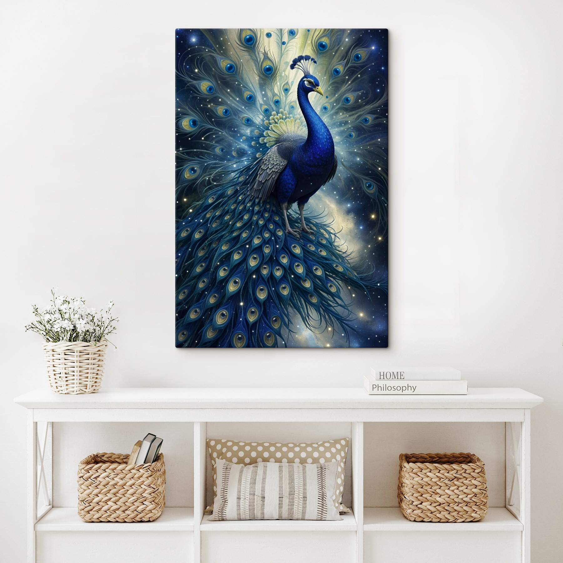 Poznaj oszałamiający wydruk na płótnie, który z pewnością przekształci każdą przestrzeń w kapryśne miejsce. “Majestic Feathers in Cosmic Harmony” zaprasza do wszechświata, w którym żywe błękity wirują z czarującą elegancją pawich piór. Wyobraź sobie, że wchodzisz do pokoju i natychmiast czujesz falę spokoju i inspiracji, a wszystko to dzięki temu niezwykłemu dziełu.