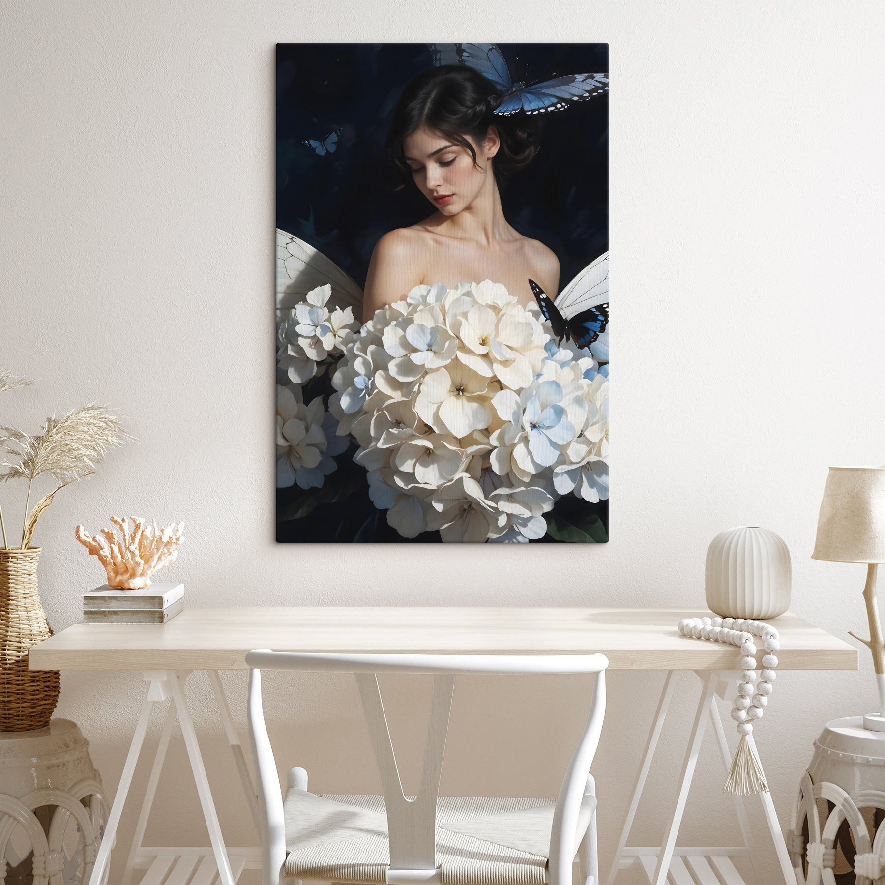 Wyobraź sobie moment, w którym natura i elegancja zderzają się ze sobą, uchwycone na tym hipnotyzującym wydruku na płótnie. Spokojna kobieta, otoczona delikatnymi kwiatami i czarującymi motylami, zaprasza powiew świeżego powietrza do każdego pomieszczenia. To jak posiadanie spokojnego ogrodu bezpośrednio na ścianie. Delikatne odcienie i wdzięczne detale dodają kojącego akcentu, idealnego do przytulnego kącika do czytania lub miejsca, w którym popijasz poranną kawę. Jedno spojrzenie i poczujesz się trochę lżej – jakby motyle mogły po prostu odfrunąć z płótna! Ten obraz to nie tylko dekoracja; to codzienne przypomnienie o pięknie i spokoju.