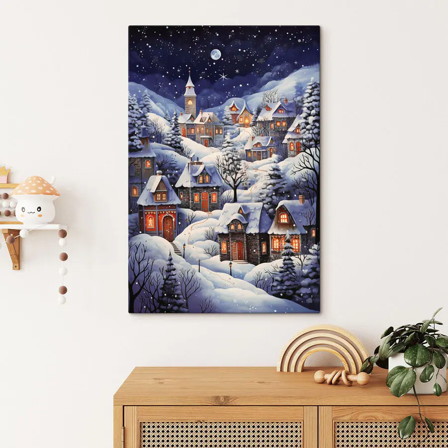 Wkrocz do sennej zimowej krainy czarów dzięki temu obrazowi “Obraz Painting of a Snowy Village”. Wyobraź sobie, że popijasz gorące kakao, patrząc na przytulne domki położone pod kocem puszystego śniegu. Wioska świeci ciepłym blaskiem, migocząc na tle gwiaździstej nocy – prawie czujesz się, jakbyś wędrował przez świąteczną bajkę! Idealna na chłodne noce, kiedy chcesz poczuć się otoczony radością i spokojem. Powieszenie tej pięknej dekoracji na ścianie doda uroku i magii każdemu zakątkowi domu.