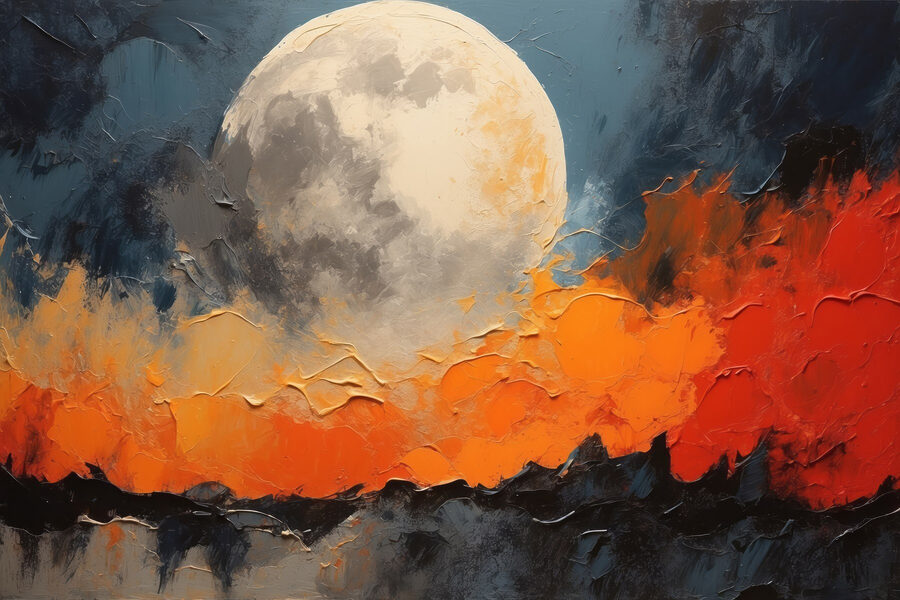 Wyobraź sobie ten idealny moment, gdy księżyc wisi nisko i jest w pełni, rzucając swój miękki blask na horyzont płonący ognistymi kolorami. Ten wydruk na płótnie “Obraz Painting of a moon and fire” przenosi tę dramatyczną scenę wprost do Twojej przestrzeni. To jak posiadanie mini arcydzieła, które szepcze opowieści o nocnym niebie i zachodach słońca.