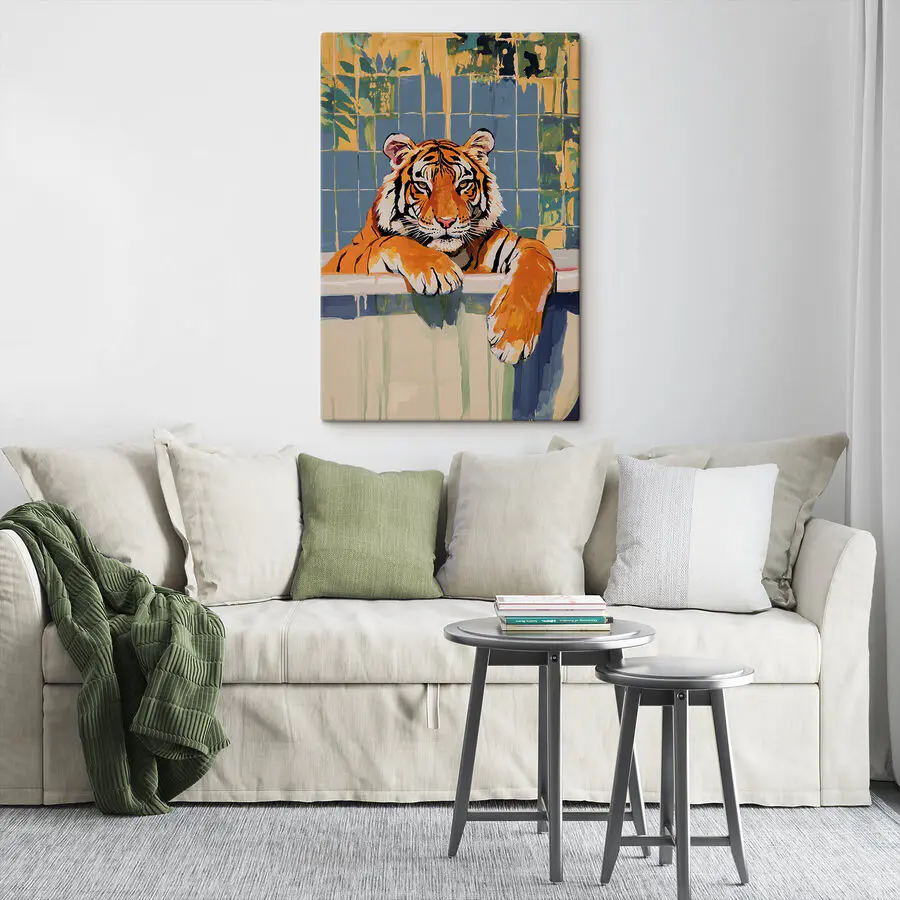 Wyobraź to sobie: tygrys wylegujący się w wannie, nonszalancki i bardzo dystyngowany. Jest dziki, a jednocześnie dziwnie uspokajający, zachwycająca sprzeczność na ścianie. Wyobraź sobie, że ten odważny wydruk na płótnie kradnie show w Twoim salonie lub nawet biurze. Goście na pewno będą się śmiać – co jest lepszego niż widok majestatycznego stworzenia biorącego kąpiel? Życie jest zbyt krótkie na nudny wystrój. Dzięki żywym kolorom i zabawnej atmosferze, ten kawałek dodaje odrobinę przygody do każdej przestrzeni. To nie tylko sztuka; to początek rozmowy.