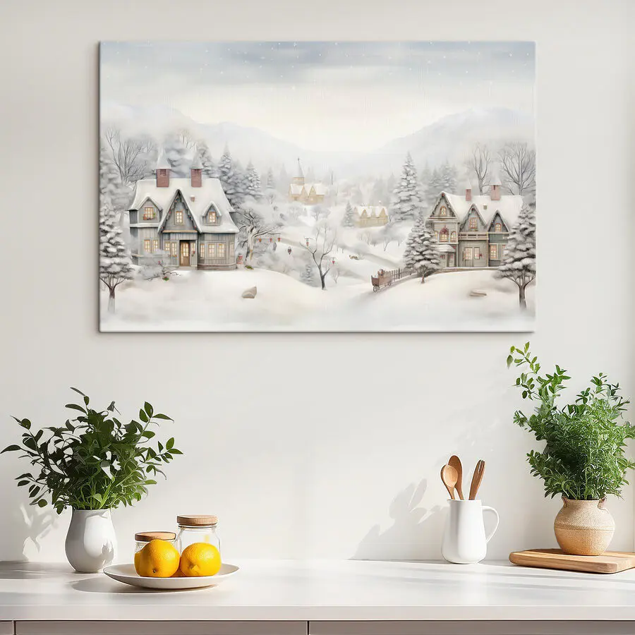 Wyobraź sobie, że wchodzisz do przytulnej zimowej krainy czarów za każdym razem, gdy wchodzisz do pokoju. Ten obraz na płótnie “Snowy Landscape with Houses and Trees” oddaje istotę pogodnego, śnieżnego dnia, w którym każdy płatek zdaje się szeptać: “Zostań na chwilę”. Miękkie odcienie i delikatna sceneria zachęcają do westchnienia relaksu. Wyobraź go sobie nad płaszczem, przynosząc ciepło w chłodne noce lub rozjaśniając cichy kącik. Jest to rodzaj elementu, który pobudza marzenia o leśnych przygodach lub gorącym kakao przy ognisku. Mieszanka kapryśnych domów wyglądających przez drzewa sugeruje historie czekające na rozwinięcie. Powieś go, a być może zainspiruje cię do walki na śnieżki – choćby tylko w myślach!