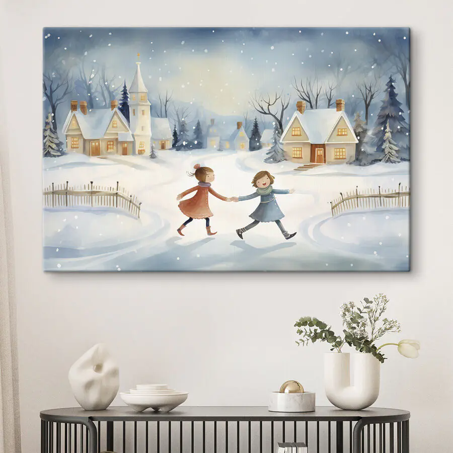 Wyobraź sobie tę zachwycającą scenę wiszącą na ścianie: dwie dziewczynki, trzymające się za ręce, tańczące na śniegu. “Obraz Couple of girls walking in the snow” oddaje ten magiczny zimowy moment, w którym śmiech wydaje się odbijać echem w mroźnym powietrzu. Przytulne domy i miękko padające płatki śniegu sprawiają, że czujesz się jak w nostalgicznej bajce.