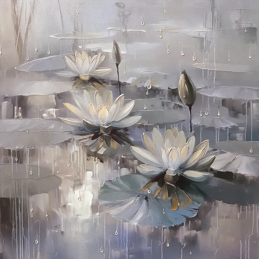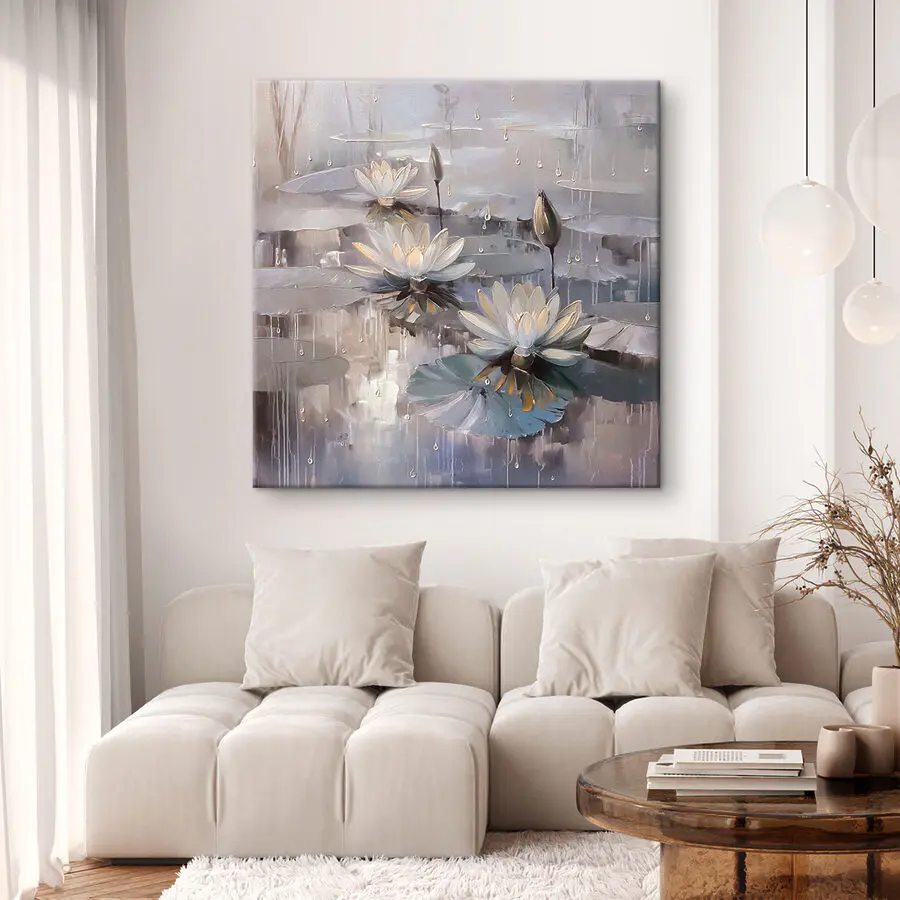 Zanurz się w spokojnej ucieczce z tym wspaniałym wydrukiem na płótnie przedstawiającym kwiaty tańczące na stawie. Łagodne odcienie i delikatne krople wody tworzą orzeźwiającą atmosferę – idealną na te dni, kiedy potrzeba odrobiny spokoju. Wyobraź sobie, że ten obraz zdobi Twoją ścianę, przekształcając nudne miejsce w spokojne odosobnienie. Znajomi pomyślą, że masz oko do sztuki, a ty po prostu usiądź wygodnie i rozkoszuj się spokojem, jaki przynosi. Poza tym, kto nie pokochałby odrobiny natury we wnętrzu? To jak posiadanie mini ogrodu zen bez kłopotów z rzeczywistymi roślinami. Chwyć go i pozwól tym pięknym kwiatom rozjaśnić swoją przestrzeń!