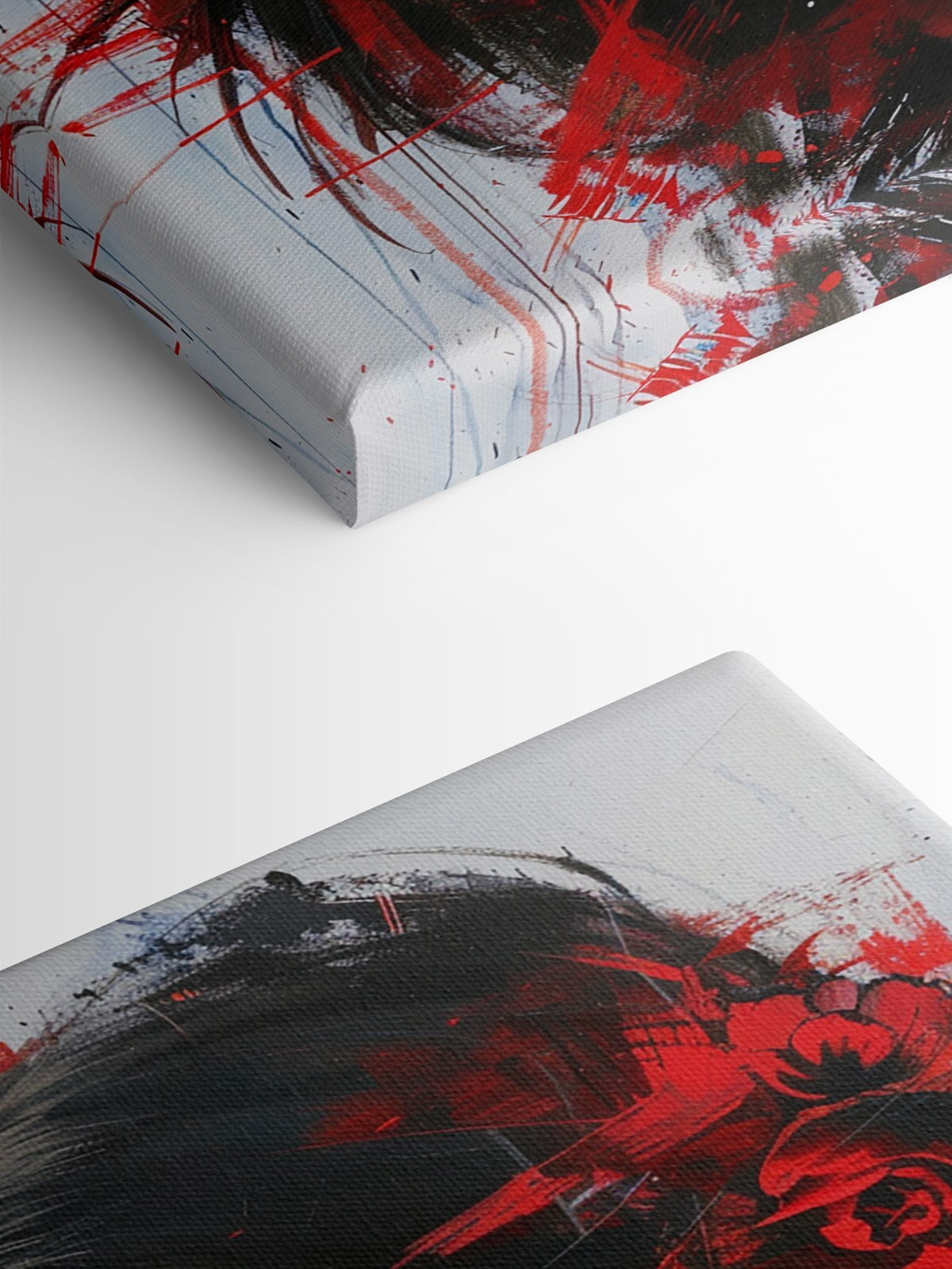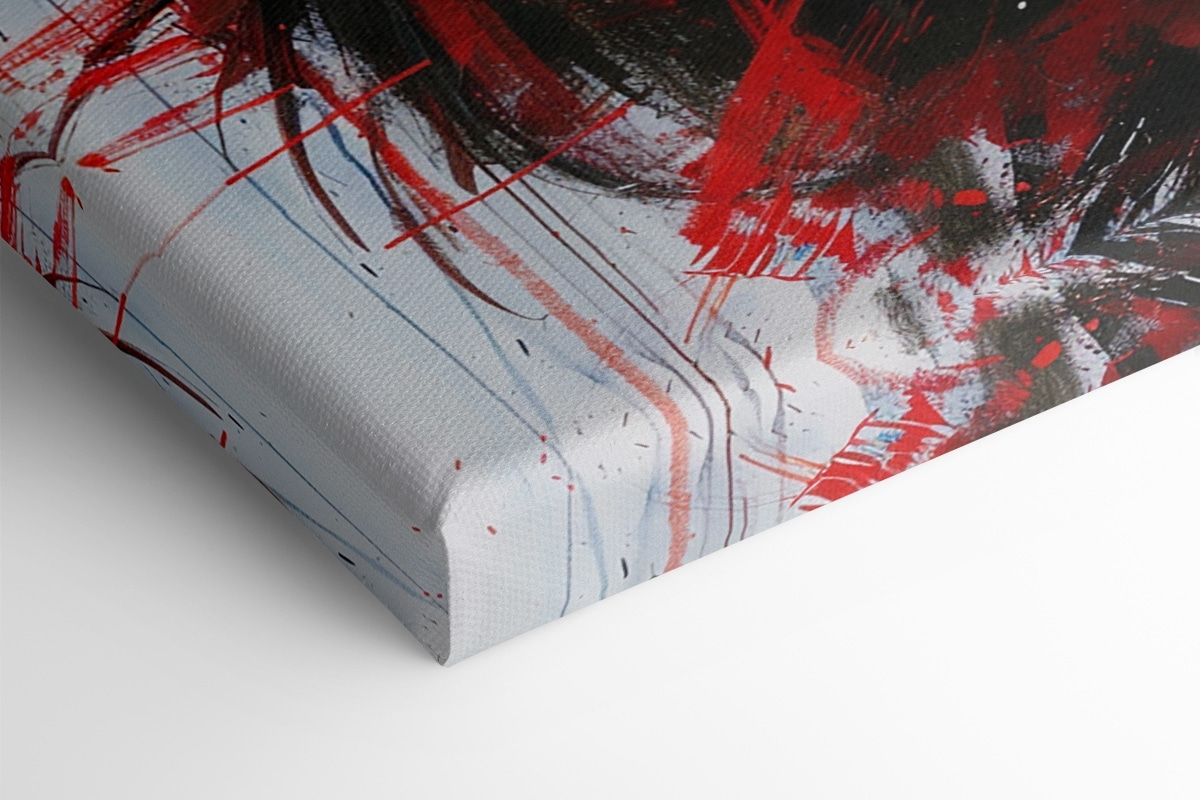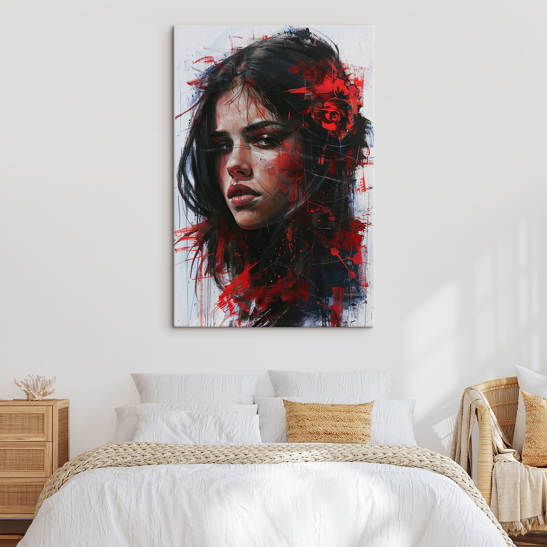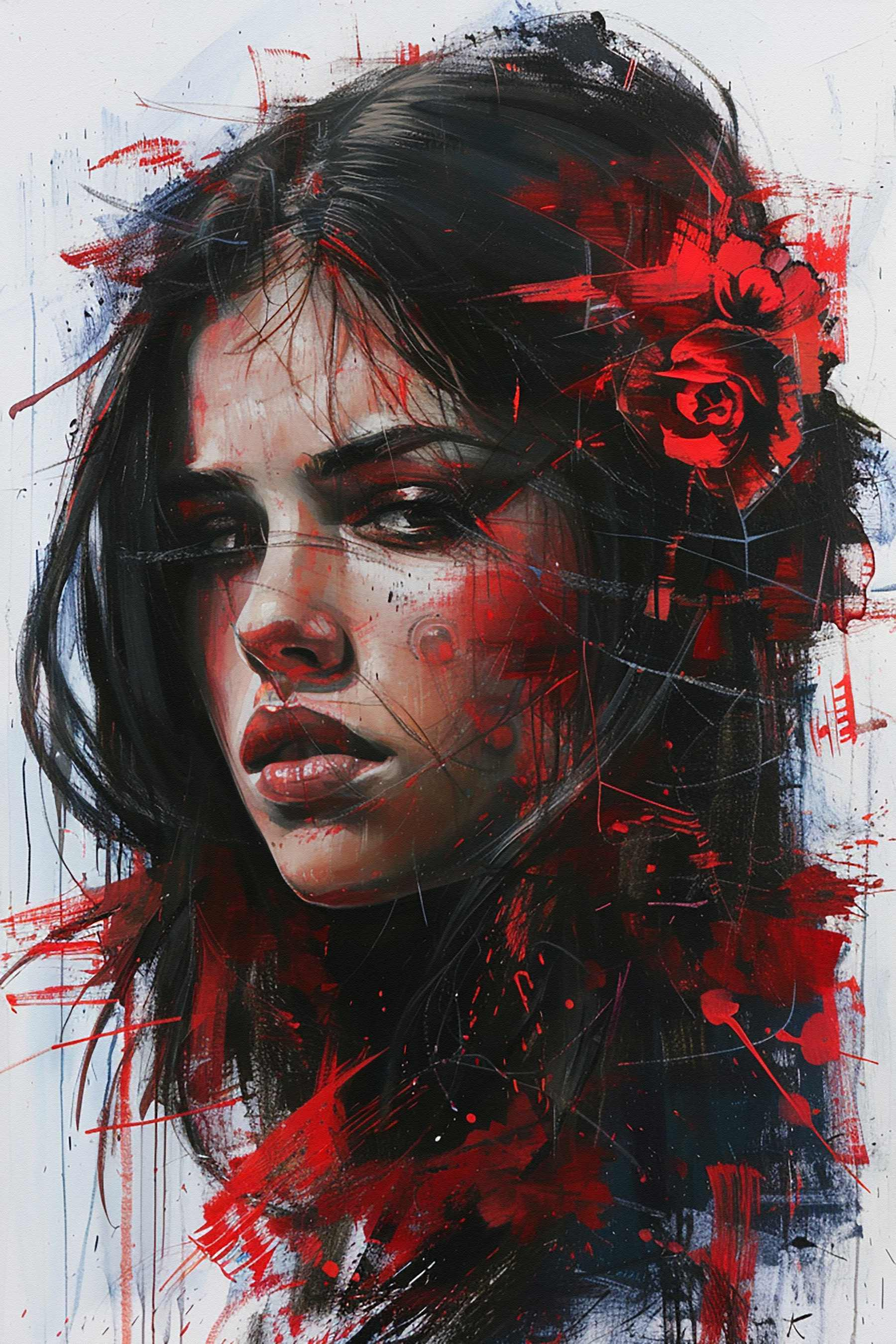 Ten efektowny wydruk na płótnie wniesie do Twojej przestrzeni odrobinę artystycznego dramatyzmu. Urzekające spojrzenie kobiety i żywe czerwone plamy farby sprawiają wrażenie, jakby miała do opowiedzenia jakąś historię. Wyobraź sobie, że wisi w przytulnym kącie lub nad nowoczesną sofą – natychmiastowy początek rozmowy! Bogate kolory tchną życie w pokój, pobudzając kreatywność, a może nawet trochę marzeń. Idealny dla tych, którzy kochają unikalny wystrój i chcą dodać szczyptę pasji do swoich ścian. To nie tylko grafika – to kawałek duszy.