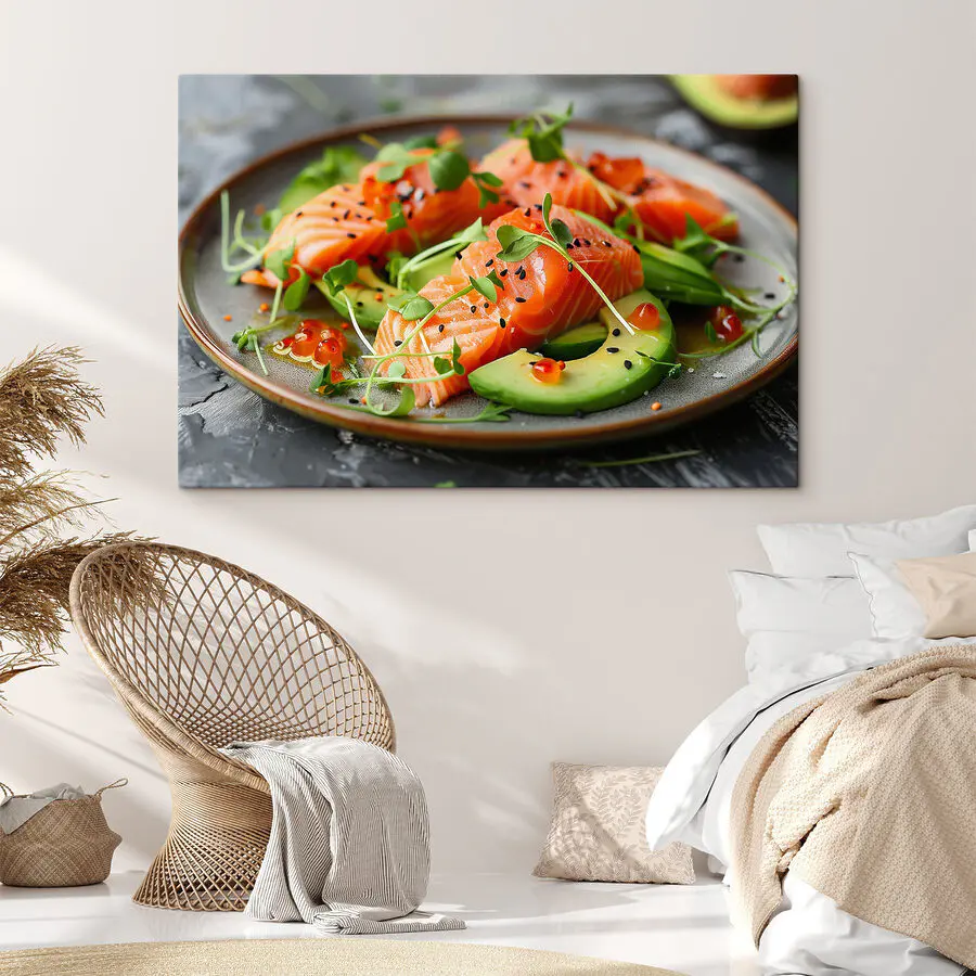 Przekształć każdą ścianę w kulinarną rozkosz dzięki temu oszałamiającemu wydrukowi na płótnie “Plate of Food on a Table”. Wyobraź sobie, że wchodzisz do swojej kuchni lub jadalni, a tam jest – przepyszna wizualna uczta ze świeżego łososia i żywego awokado, artystycznie ułożonych. To tak, jakby twoje posiłki uśmiechały się do ciebie! Idealny dla smakoszy lub każdego, kto ceni odważne kolory i piękne prezentacje. Ten element dodaje odrobiny elegancji, jednocześnie pobudzając apetyt na pyszne potrawy. To nie tylko dekoracja; to zaproszenie do delektowania się każdą chwilą, a może nawet zainspirowania przyjęcia lub dwóch. Któż nie chciałby mieć na swoich ścianach tego wspaniałego akcentu smakowego?