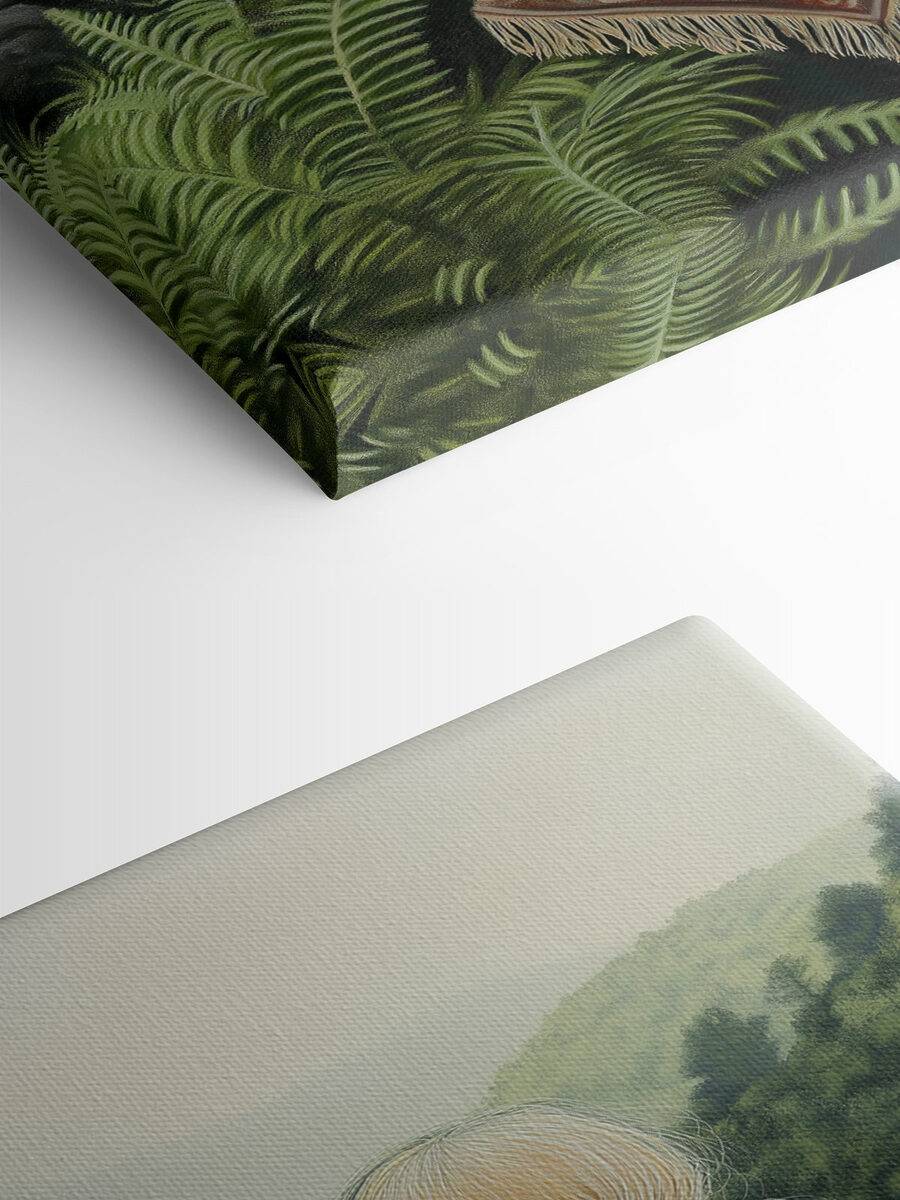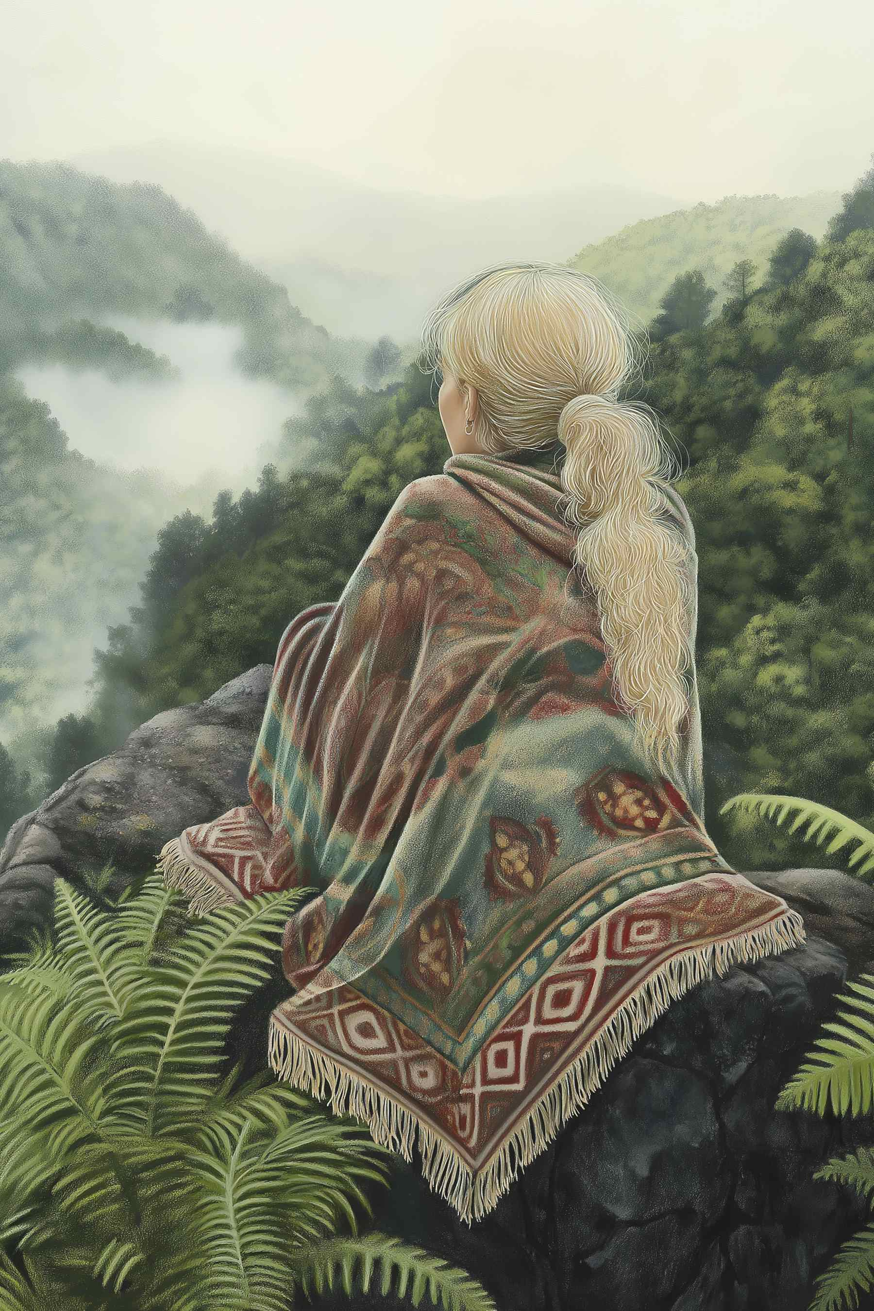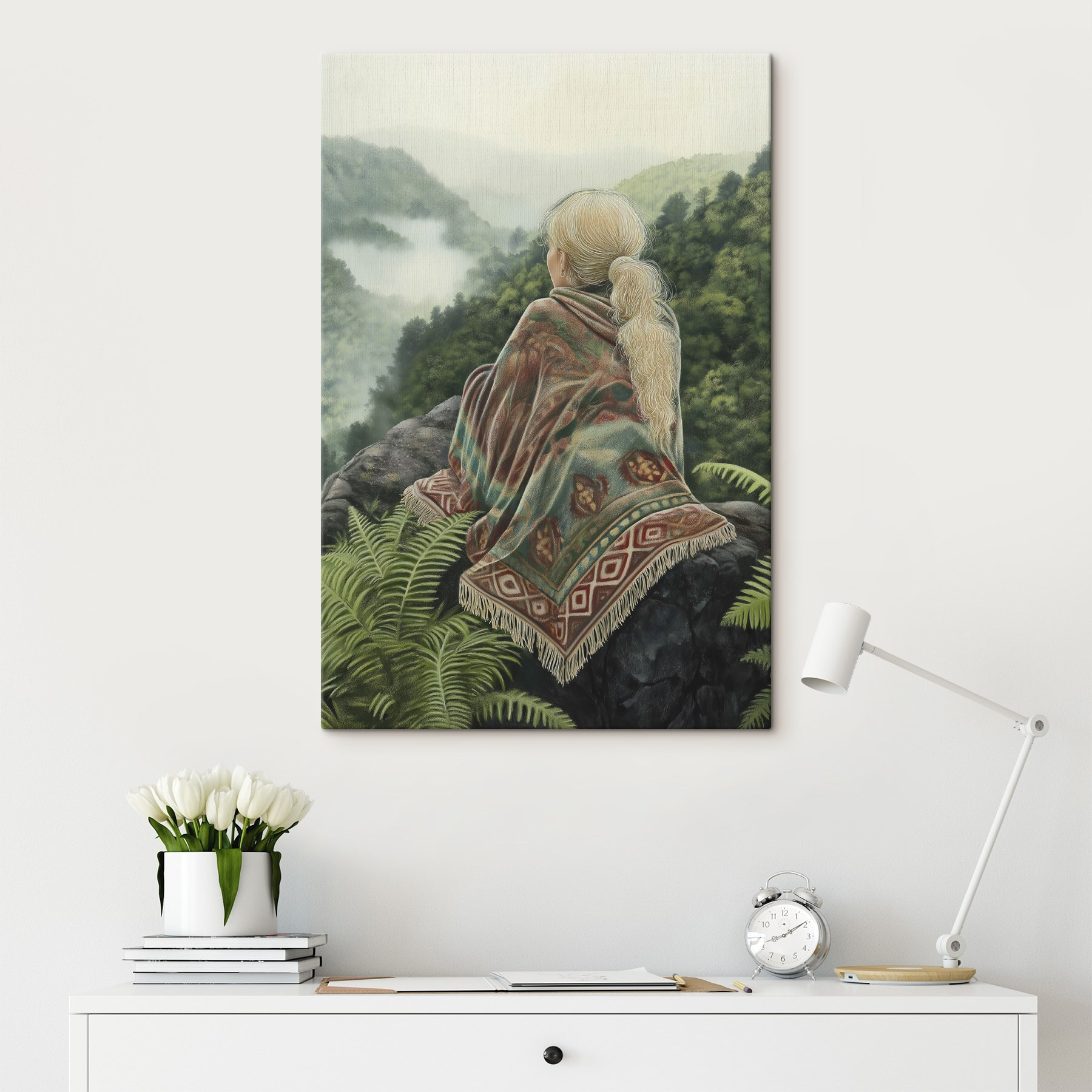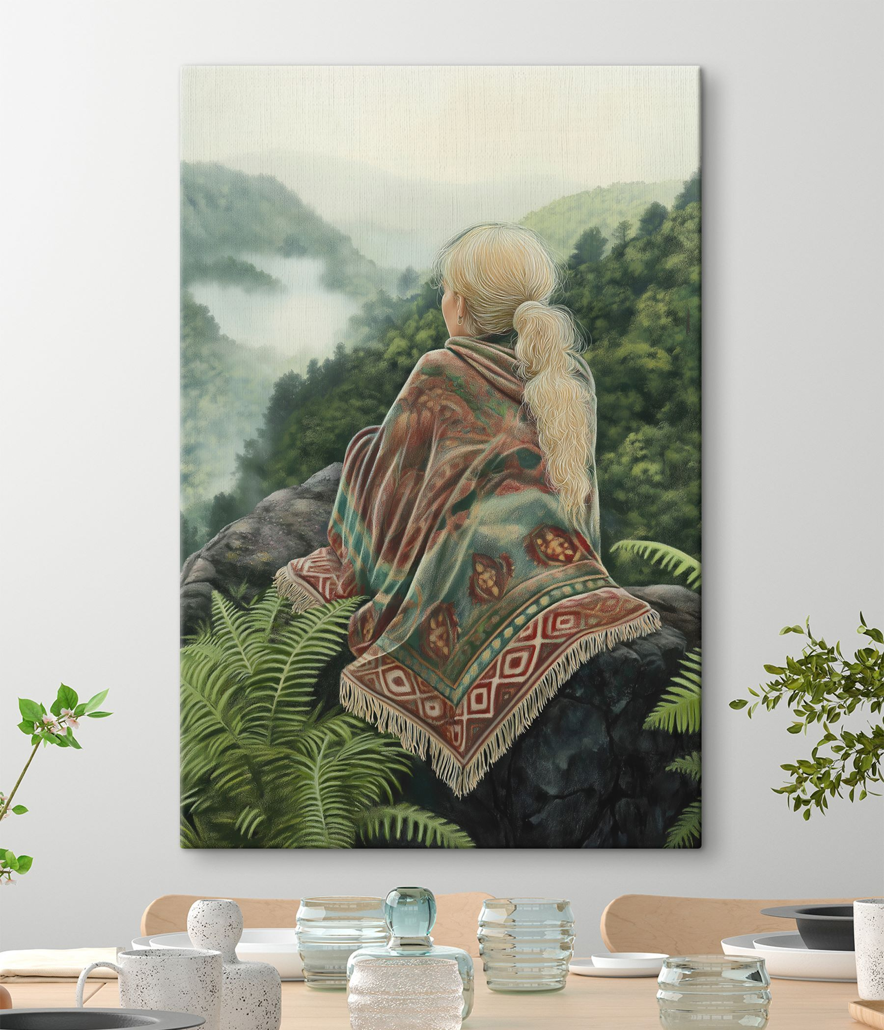 Wyobraź sobie spokojny wypoczynek na swojej ścianie. Ten wydruk na płótnie, przedstawiający kobietę przytulającą się do skały, zagubioną w myślach, wpatrującą się w senną, mglistą dolinę, wnosi kawałek spokoju natury do każdej przestrzeni. Delikatne zielenie i miękkie szarości tworzą atmosferę, która sprawia, że chce się wziąć głęboki oddech i westchnąć. Umieść go nad sofą, a może stać się początkiem rozmowy – lub przynajmniej idealnym tłem dla filiżanki herbaty w deszczowy dzień. Kto nie chciałby poczuć się jak na wycieczce w lesie, nie wychodząc z salonu? To właśnie ten rodzaj magii.