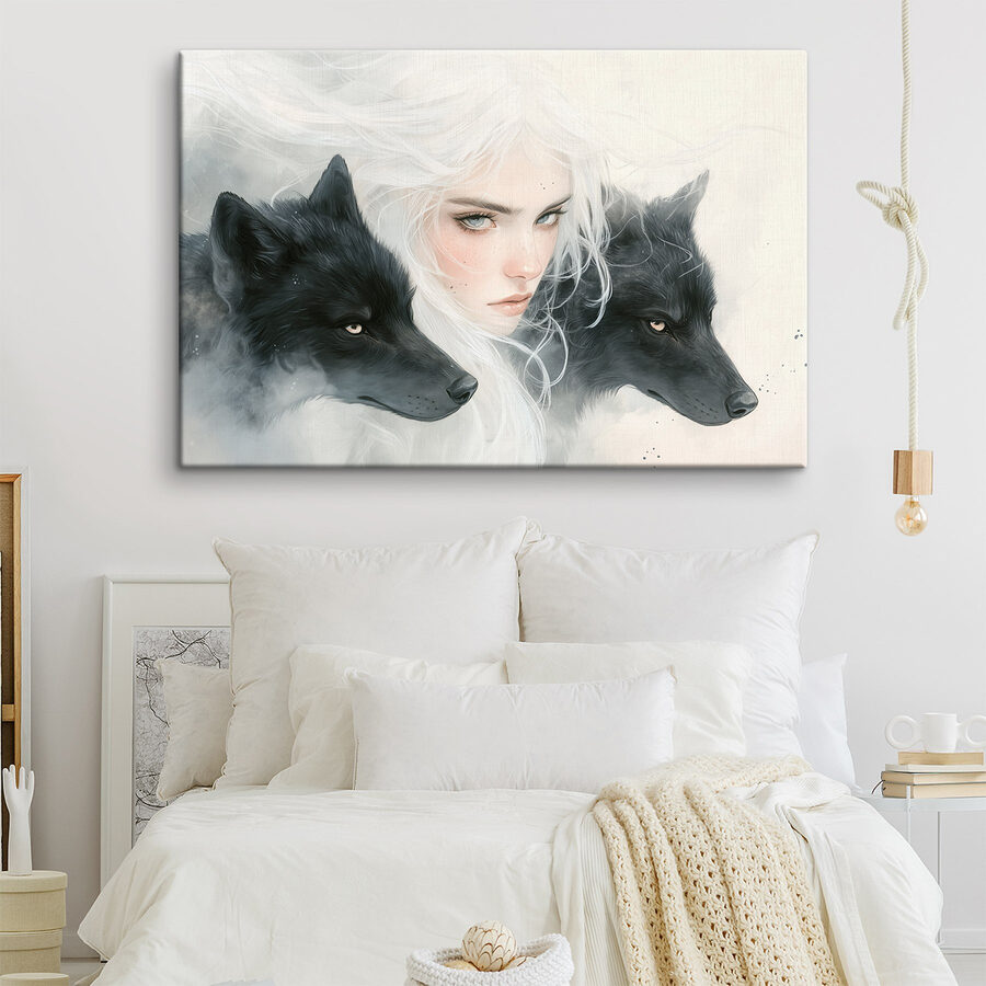 Ten hipnotyzujący wydruk na płótnie przedstawia uderzającą kobietę z białymi włosami i dwoma zaciekłymi wilkami u jej boku. Oddaje mistyczny klimat, idealny dla tych, którzy kochają unikalny wystrój. Wyobraź sobie, że powiesisz ten obraz w przytulnym kąciku do czytania lub w tętniącym życiem salonie – z pewnością wywoła rozmowy! Szczegóły są oszałamiające, a czujne spojrzenie każdego wilka dodaje warstwę intrygi. To jak wniesienie odrobiny dzikiej natury do wnętrza, przypomnienie o sile i pięknie. Idealny dla tych, którzy cenią sztukę, która opowiada historię bez wypowiadania słów. Wystarczy jedno spojrzenie, by przenieść się w świat przygody!
