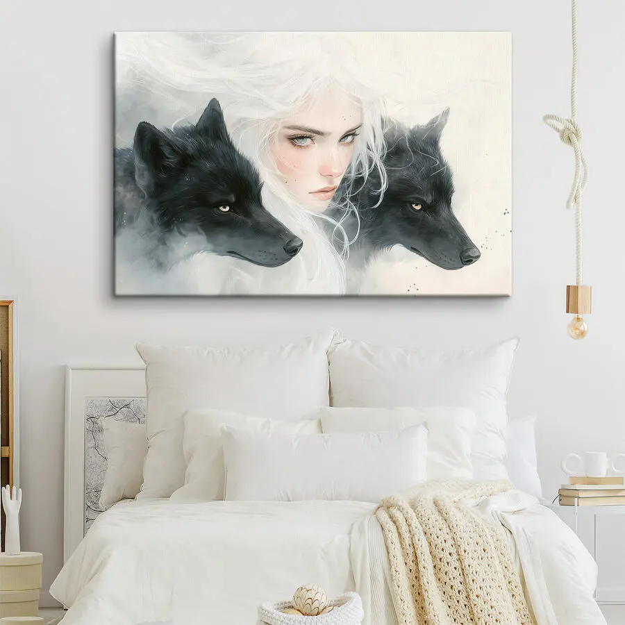 Ten hipnotyzujący wydruk na płótnie przedstawia uderzającą kobietę z białymi włosami i dwoma zaciekłymi wilkami u jej boku. Oddaje mistyczny klimat, idealny dla tych, którzy kochają unikalny wystrój. Wyobraź sobie, że powiesisz ten obraz w przytulnym kąciku do czytania lub w tętniącym życiem salonie – z pewnością wywoła rozmowy! Szczegóły są oszałamiające, a czujne spojrzenie każdego wilka dodaje warstwę intrygi. To jak wniesienie odrobiny dzikiej natury do wnętrza, przypomnienie o sile i pięknie. Idealny dla tych, którzy cenią sztukę, która opowiada historię bez wypowiadania słów. Wystarczy jedno spojrzenie, by przenieść się w świat przygody!