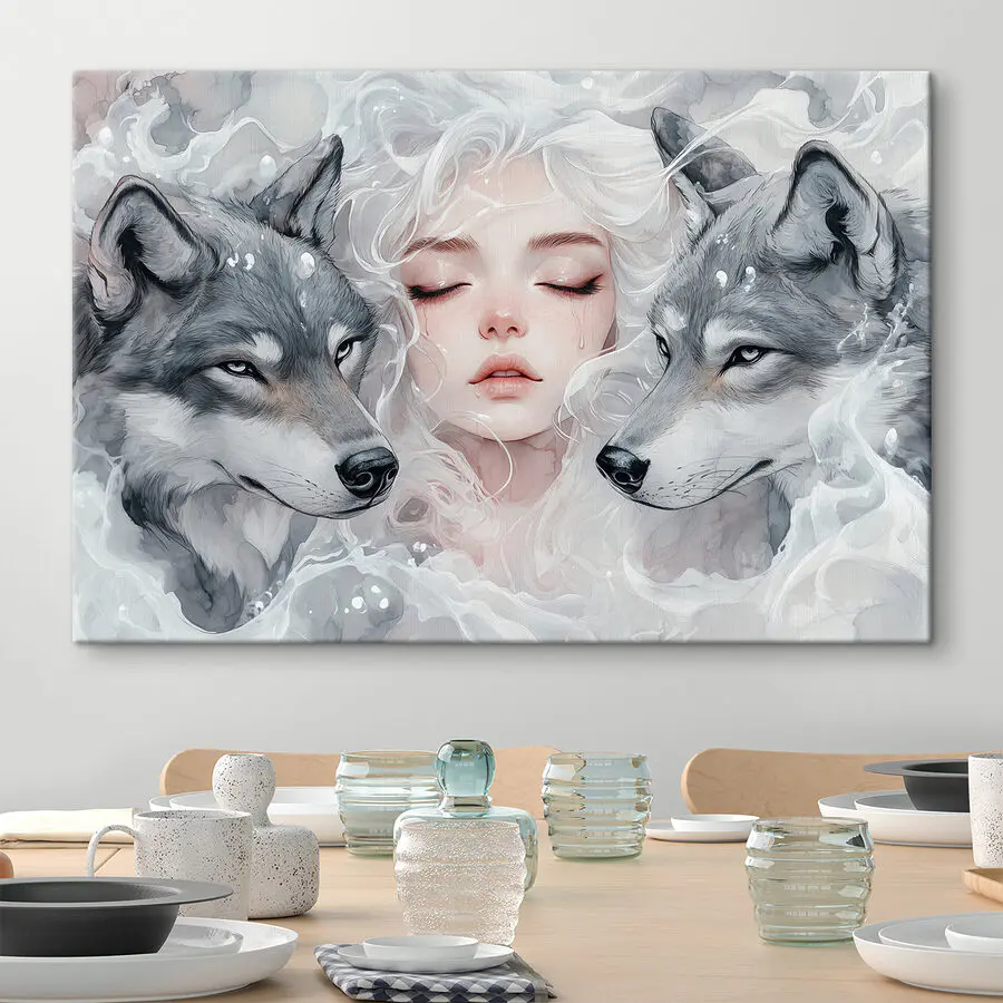 Zanurz się w kapryśnym świecie dzięki temu drukowi na płótnie przedstawiającemu pogodną kobietę z białymi włosami i dwoma czujnymi wilkami. Poważnie, jak uderzające to jest? Wyobraź sobie, że wieszasz ten obraz na ścianie – to jak powiew świeżego powietrza. Te wilki, z ich przenikliwymi oczami, dodają nutkę tajemniczości, podczas gdy delikatne kolory tworzą uspokajającą atmosferę. Idealny do przytulnego kącika do czytania lub pustej ściany, na którą się gapisz. To prawie jak zaproszenie natury do domu, ale bez zabłoconych butów. Każde spojrzenie przynosi odrobinę ucieczki od codziennego zgiełku. Zaufaj, że pobudzi do rozmów, a może nawet do marzeń. Idealny dla każdego, kto ceni sztukę, która opowiada historię bez słowa.