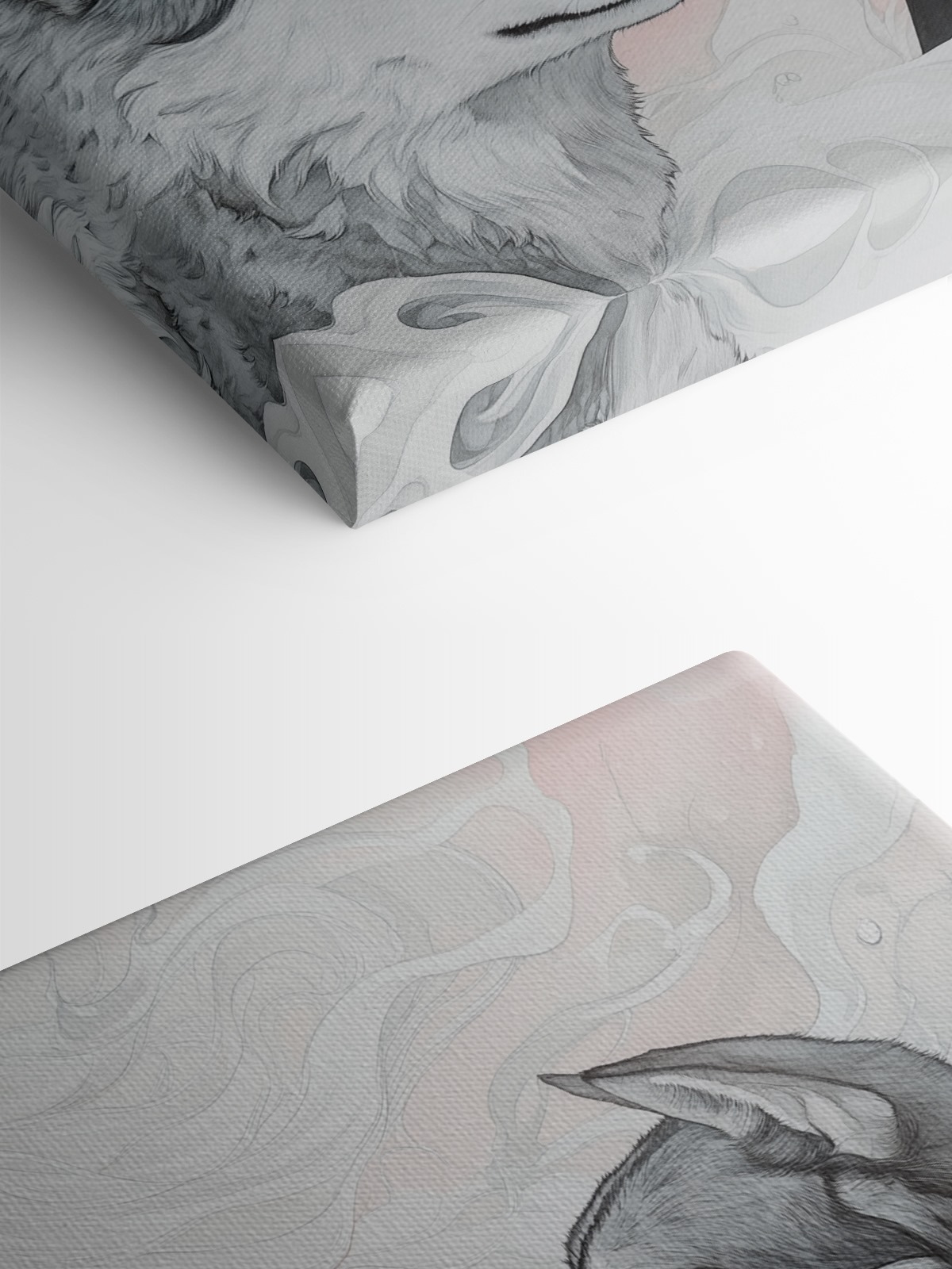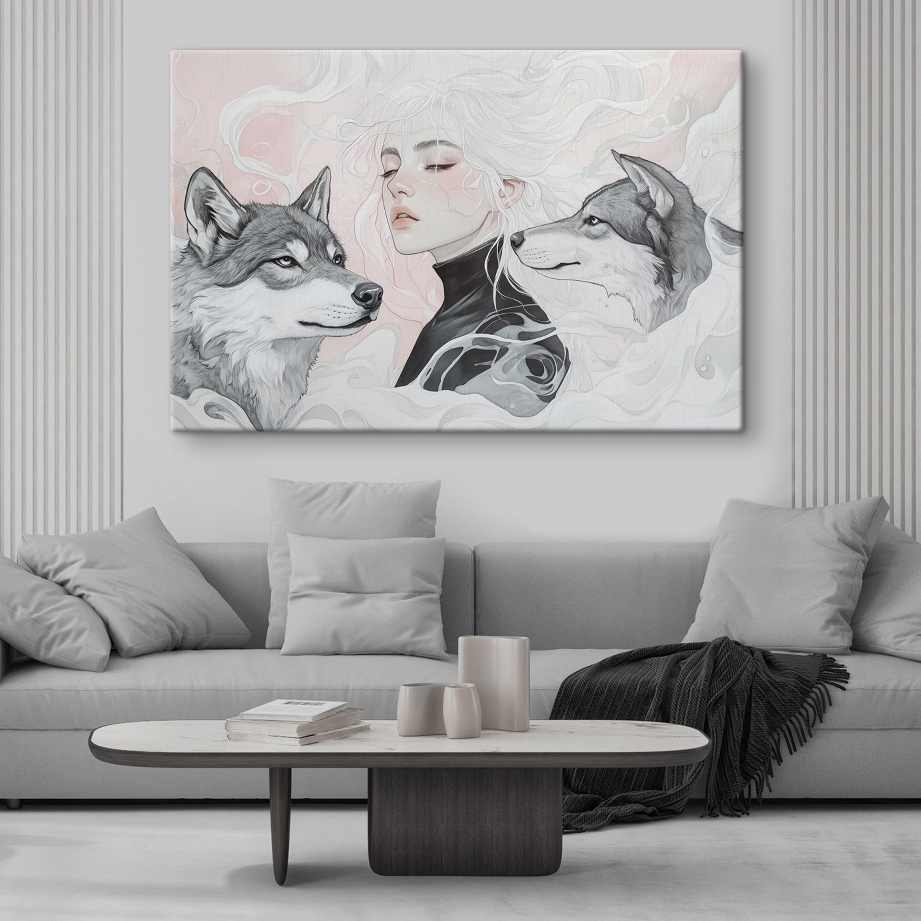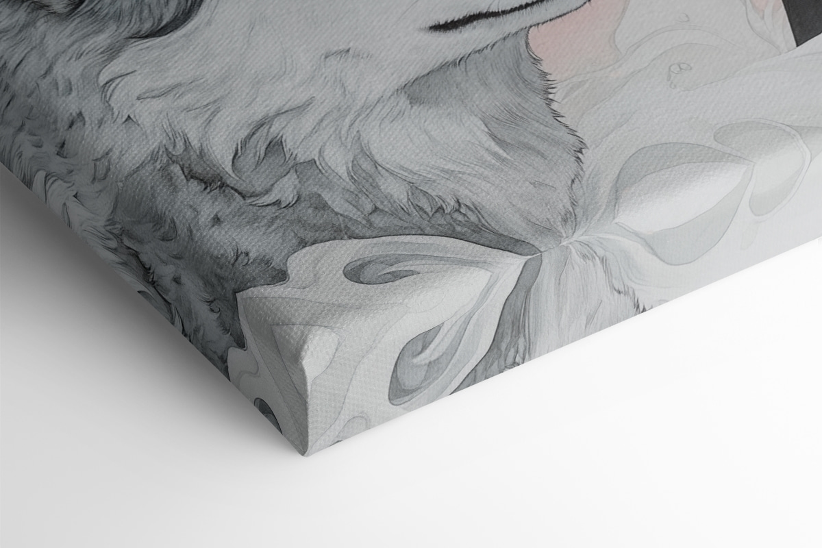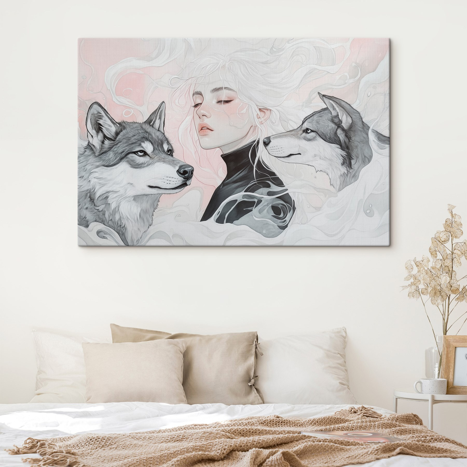 Wyobraź sobie przytulny zakątek w swoim domu, w którym ciepło osobowości spotyka się z odrobiną dzikiej natury. Ten wydruk na płótnie przedstawiający kobietę z rozwianymi białymi włosami, otoczoną przez dwa czujne wilki, dodaje fascynującej narracji do każdej przestrzeni. Miękkie odcienie tworzą zachęcającą atmosferę, niemal szepcząc tajemnice natury. Obraz nie tylko siedzi tam, ale angażuje każdego, kto przechodzi obok, wzbudzając ciekawość i być może odrobinę marzeń. Idealny na pustą ścianę lub do rozpoczęcia rozmowy nad kanapą, przynosi zachwycającą mieszankę spokoju i siły. Któż nie poczułby się zainspirowany patrząc na tak uderzające dzieło?