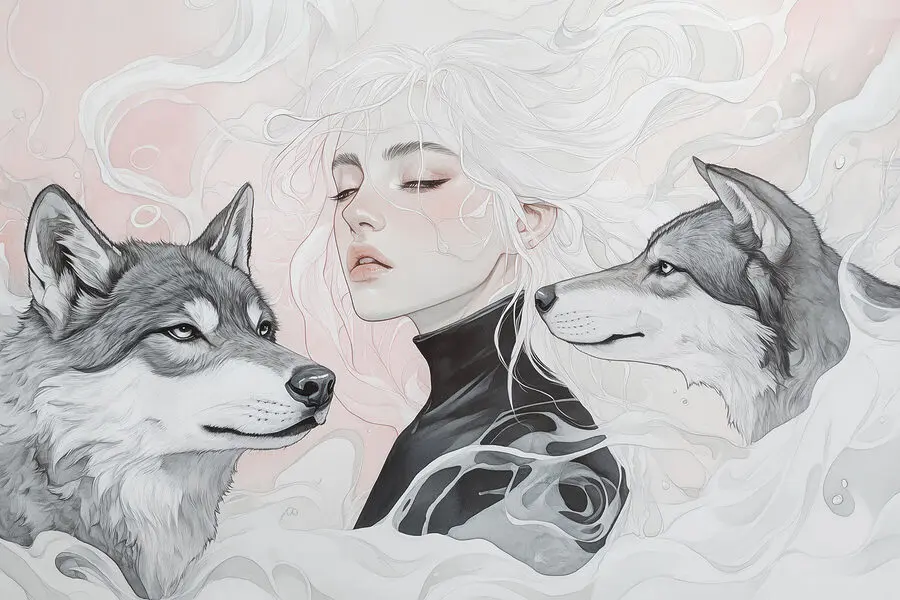 Wyobraź sobie przytulny zakątek w swoim domu, w którym ciepło osobowości spotyka się z odrobiną dzikiej natury. Ten wydruk na płótnie przedstawiający kobietę z rozwianymi białymi włosami, otoczoną przez dwa czujne wilki, dodaje fascynującej narracji do każdej przestrzeni. Miękkie odcienie tworzą zachęcającą atmosferę, niemal szepcząc tajemnice natury. Obraz nie tylko siedzi tam, ale angażuje każdego, kto przechodzi obok, wzbudzając ciekawość i być może odrobinę marzeń. Idealny na pustą ścianę lub do rozpoczęcia rozmowy nad kanapą, przynosi zachwycającą mieszankę spokoju i siły. Któż nie poczułby się zainspirowany patrząc na tak uderzające dzieło?
