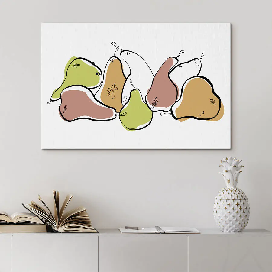 Rozjaśnij każde pomieszczenie tym uroczym wydrukiem na płótnie przedstawiającym grupę żywych gruszek, narysowanych zabawnymi czarnymi liniami. To jak mała owocowa fiesta na ścianie! Wyobraź sobie przytulną kuchnię lub kącik jadalny ozdobiony tym dziwacznym dziełem – każdy z pewnością się uśmiechnie, gdy go zobaczy. Kolory przypominają świeżą letnią sałatkę i wprowadzają przyjazną, domową atmosferę. Idealny dla miłośników jedzenia lub każdego, kto po prostu lubi odrobinę kaprysu. Powieś ją i pozwól, by rozmowa sama się potoczyła – nic tak nie rozkręca pogawędki jak garść uroczych gruszek!