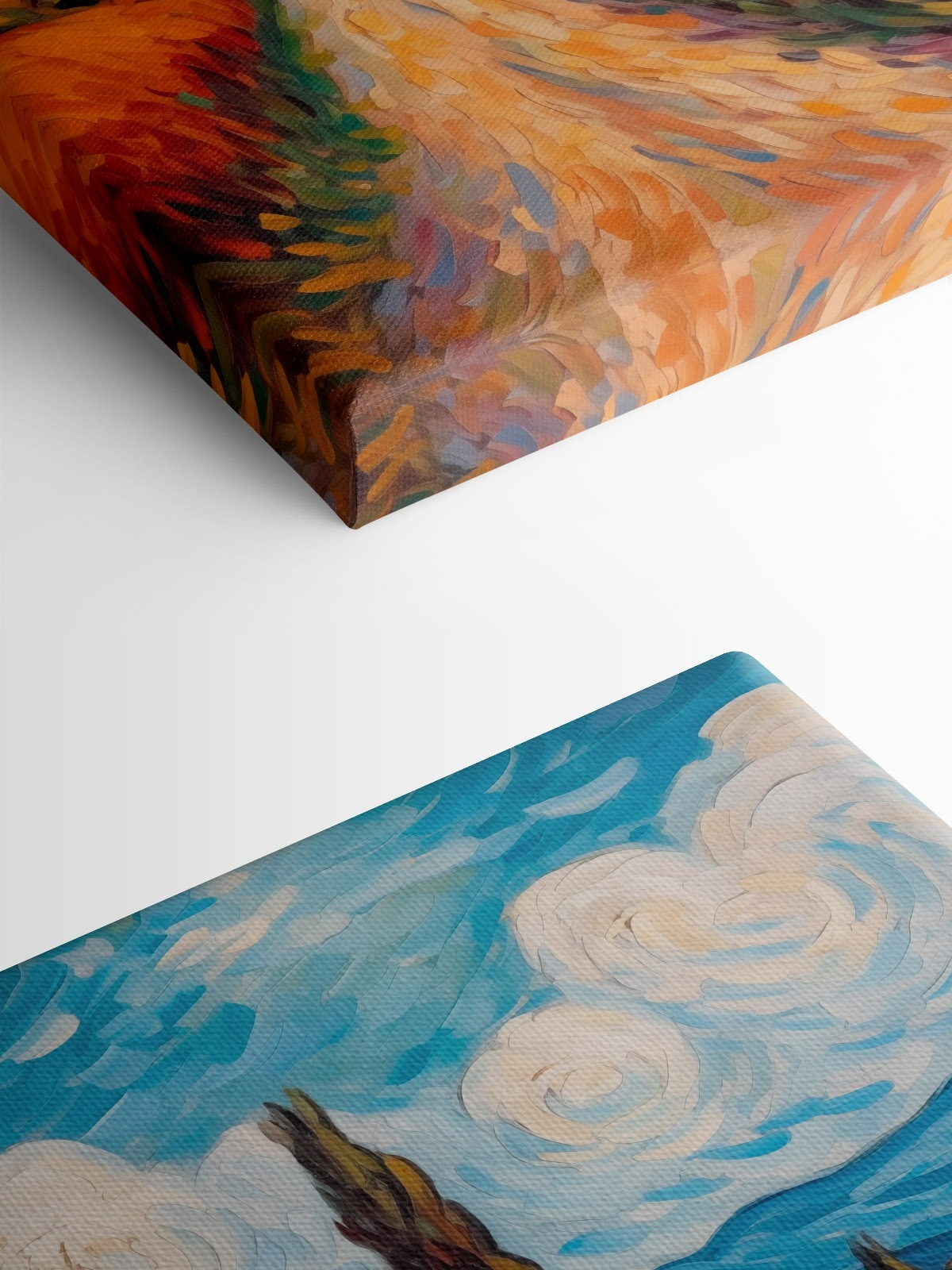 Wyobraź sobie spacer po oświetlonej słońcem ścieżce, otoczonej złotymi polami pszenicy. Ten czarujący obraz na płótnie przedstawiający urokliwy dom położony wśród kołyszących się łodyg wniesie tę pogodną atmosferę do Twojej przestrzeni. Jego żywe kolory i kapryśne pociągnięcia pędzla tworzą zachęcającą atmosferę – idealną do marzeń przy filiżance kawy lub zagubienia się w myślach po długim dniu. Powieś go w salonie lub przytulnym kąciku do czytania i obserwuj, jak pobudza rozmowę lub po prostu dodaje uroku. To jak posiadanie małego kawałka wiejskiej przytulności, gdziekolwiek jesteś. Poza tym, kto nie kocha idealnego tła zachodu słońca? To przypomnienie o prostocie, spokoju, a może nawet odrobinie przygody czekającej tuż za horyzontem.