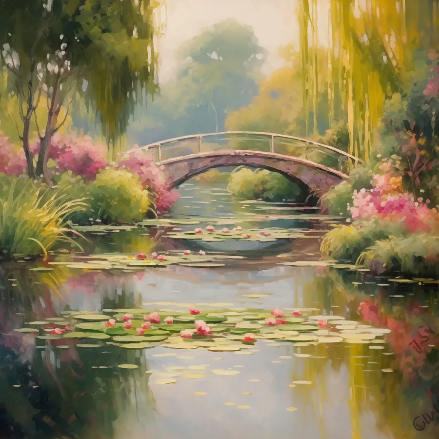 Odmień swoją przestrzeń dzięki temu czarującemu obrazowi na płótnie “Bridge over a Pond with Lily Pads and Flowers”. Wyobraź sobie, że za każdym razem, gdy spojrzysz na ten obraz, znajdziesz się w spokojnym miejscu. Delikatne pastele pięknie się komponują, ożywiając senny ogród, w którym kwiaty flirtują z delikatną bryzą, a płatki lilii kołyszą się w wodzie. To nie tylko dekoracja; tworzy przytulny kącik, który zachęca do marzeń. Wyobraź sobie niedzielny poranek, popijając kawę i wpatrując się w tę spokojną scenę. To jak mini-wakacje w domu. Idealny do dodania odrobiny piękna natury do każdego pomieszczenia!