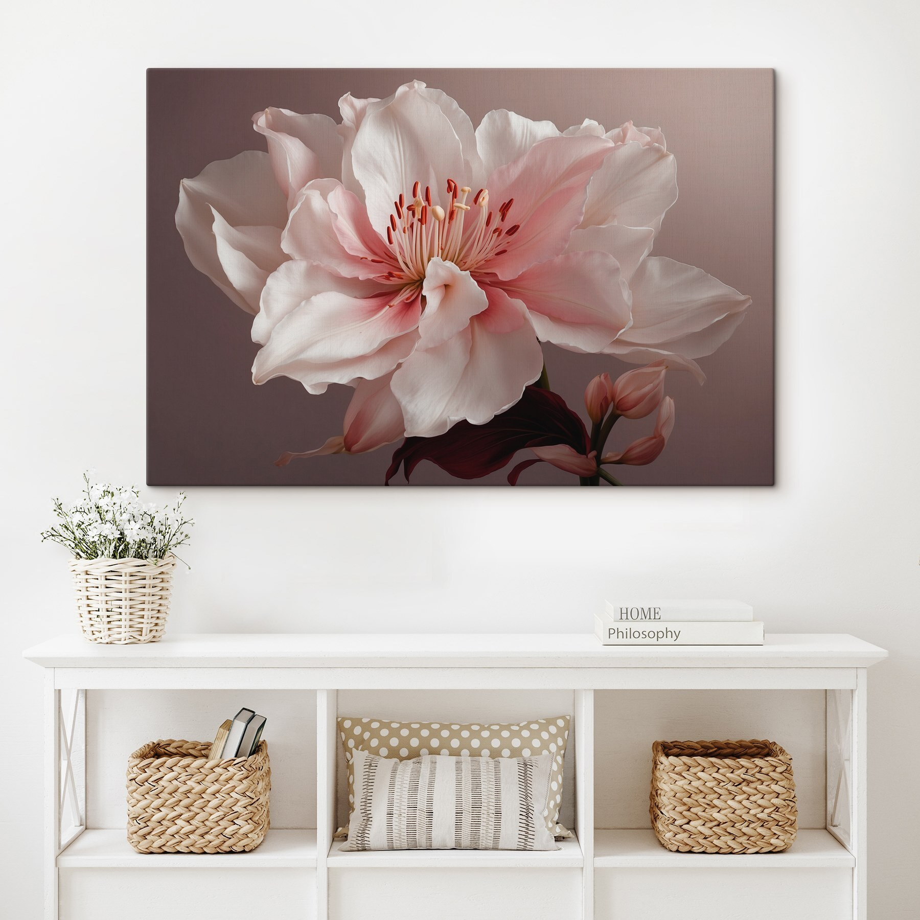 Odmień każdą przestrzeń dzięki obrazowi “Delicate Petals in Soft Hues”. Ten wydruk na płótnie oddaje delikatne piękno kwiatów, niczym przytulny uścisk w wiosenny poranek. Wyobraź sobie, że wchodzisz do pokoju i witają Cię te oszałamiające kwiaty – to tak, jakby natura zdecydowała się wejść do środka. Idealny do rozjaśnienia nudnego kąta lub dodania spokojnego akcentu do salonu, wprowadza miękki, marzycielski klimat. Połącz ją z bujną zielenią lub pozostaw samą sobie i obserwuj, jak przyciąga wzrok. Bo spójrzmy prawdzie w oczy, kto nie kocha kwiatów, które nigdy nie więdną?