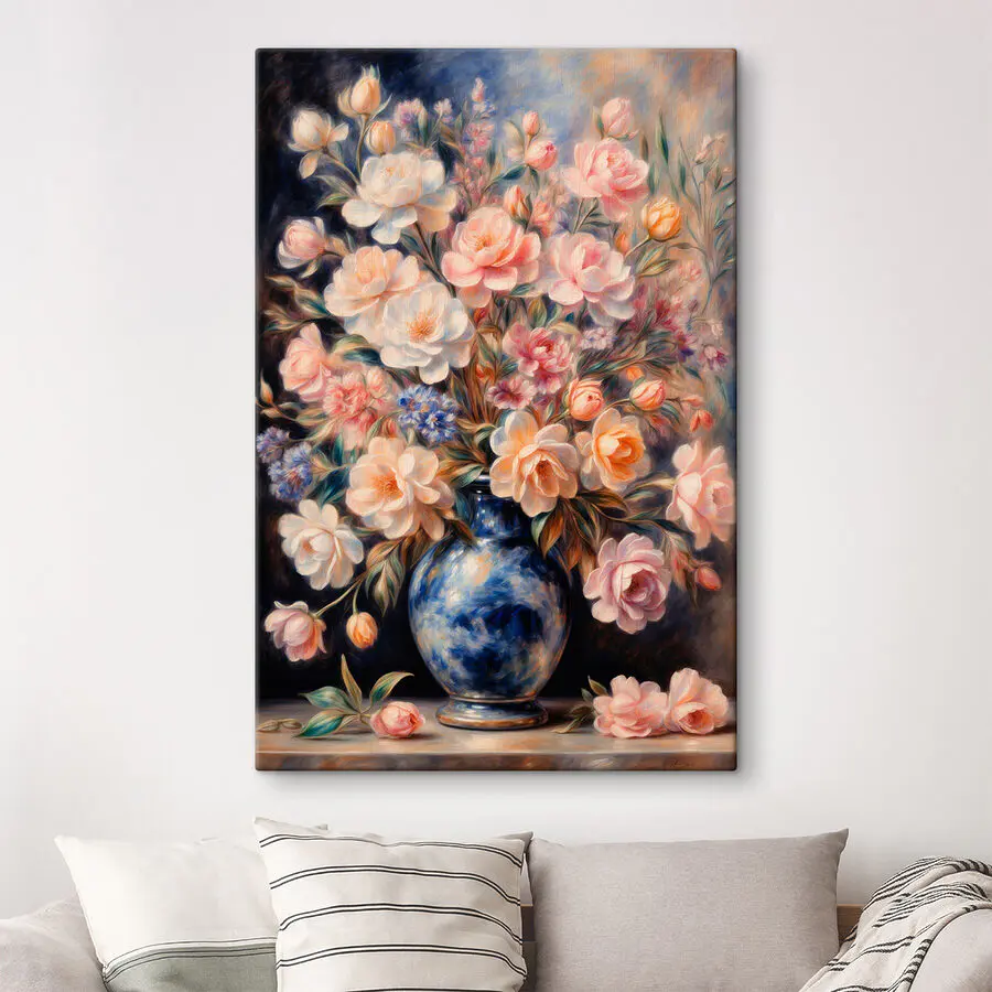 Odmień każdą przestrzeń dzięki temu wspaniałemu obrazowi na płótnie “Kwiaty w niebieskim wazonie”. Wyobraź sobie, że wchodzisz do pokoju i zostajesz powitany przez wybuch delikatnych różów i błękitów, tak jakby wiosna właśnie postanowiła rozpakować swoje torby. Delikatne płatki tańczące na tle bogatego niebieskiego wazonu nadają świeżego klimatu bez przesady. Idealny do przytulnego kącika lub nawet tętniącego życiem salonu, dodaje odrobinę uroku natury. To jak mały ogródek na ścianie – nie wymaga podlewania! Więc śmiało, niech kwiatowe szepty rozjaśnią Twój dzień i być może zainspirują do marzeń o słonecznych popołudniach i piknikach.