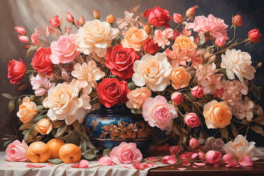 Wnieś żywy akcent do każdego pomieszczenia dzięki oszałamiającemu obrazowi na płótnie “Wazon z kwiatami i owocami”. Ten obraz oddaje piękno kwiatów i owoców w tak żywy sposób, że przypomina mini ogród na ścianie. Wyobraź sobie, że każdego ranka budzisz się z tym radosnym widokiem – to uczta dla oczu! Ciepłe kolory i zachęcające detale sprawiają, że puste ściany stają się miejscem ożywionych rozmów. Pomyśl o goszczeniu przyjaciół; będą podziwiać dzieło i nagle wszyscy staną się krytykami galerii! Jest idealny do rozjaśnienia przestrzeni życiowej, a nawet przytulnego kącika. Możesz nawet przyłapać się na marzeniach o słonecznym popołudniu w otoczeniu natury. Tylko ostrzeżenie: może zainspirować spontaniczne plany piknikowe!