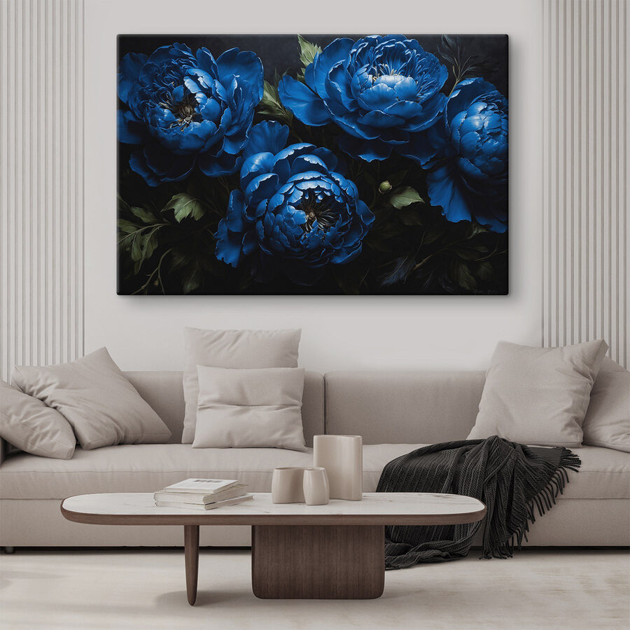 Przekształć każdą ścianę w miejsce do rozmów dzięki temu wspaniałemu obrazowi na płótnie przedstawiającemu grupę niebieskich kwiatów. Te piękności tryskają energią, a jednocześnie mają uspokajający klimat, który przeniesie Cię do spokojnego ogrodu. Wyobraź sobie, że wchodzisz do pokoju i jesteś otulony ich bogatymi odcieniami; to jak mini-wakacje za każdym razem. Idealne dla tych, którzy pragną uroku natury bez kłopotliwego podlewania! Ponadto, wnoszą one odrobinę koloru, który dobrze komponuje się ze wszystkim. To jak ciepły uścisk – kto tego nie kocha?