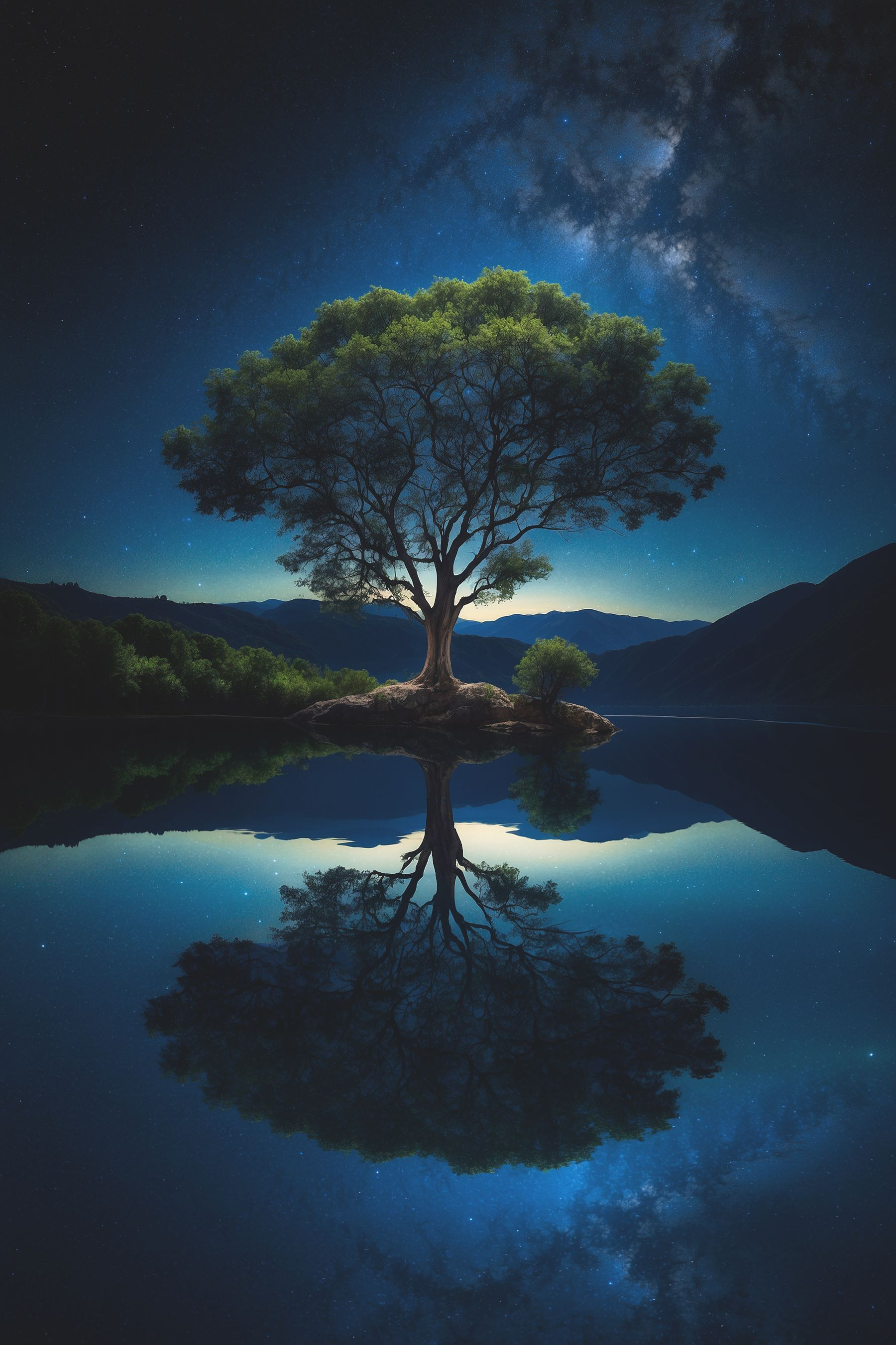 Odmień swoją przestrzeń dzięki temu wspaniałemu obrazowi na płótnie “Drzewo na wyspie na jeziorze”. Wyobraź sobie pogodny wieczór, w którym majestatyczne drzewo stoi wysoko, doskonale odbijając się w spokojnych wodach pod rozgwieżdżonym niebem. To jak własne dzieło sztuki natury, które tylko czeka, aby ozdobić twoje ściany.