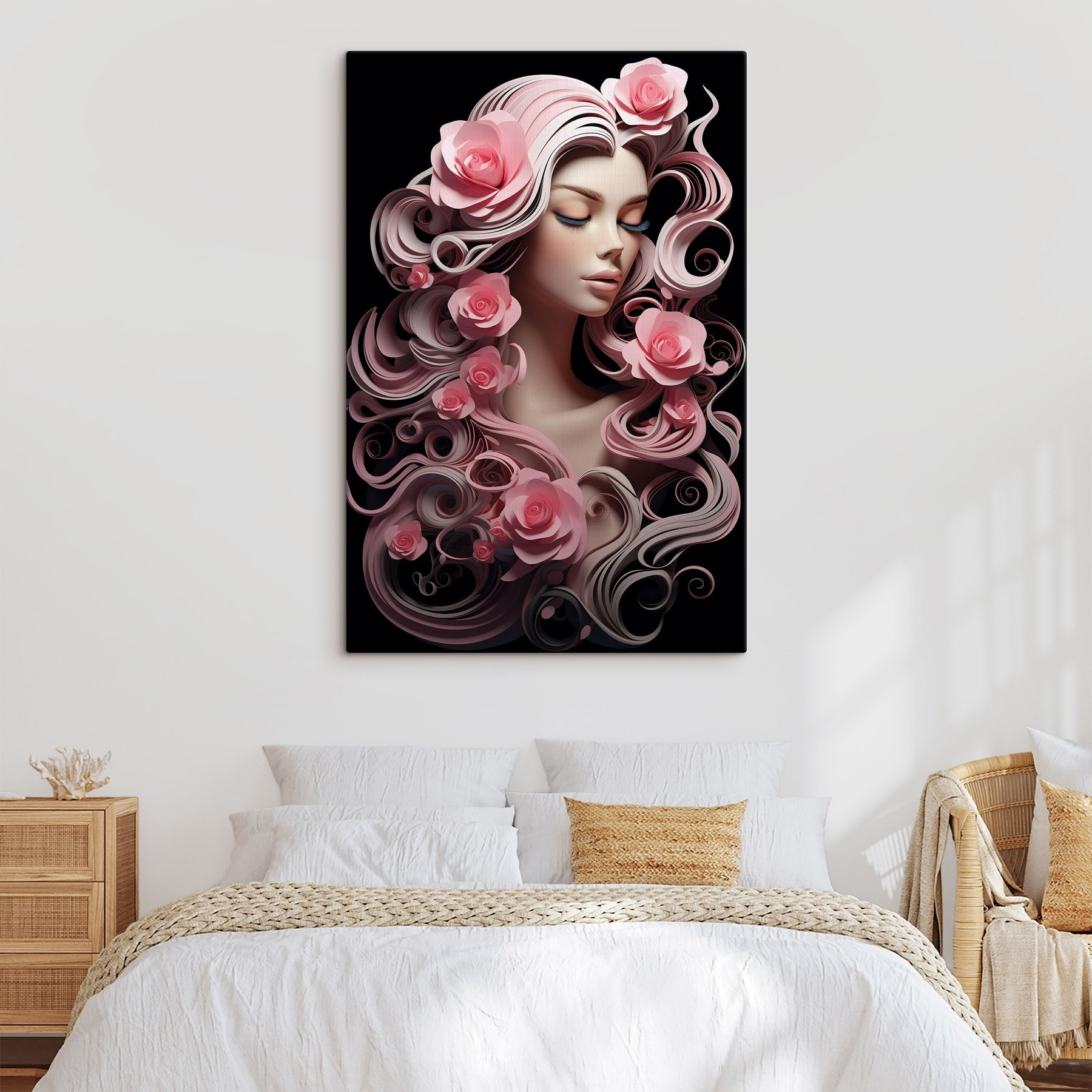 Wnieś odrobinę kaprysu na pustą ścianę dzięki temu wspaniałemu drukowi na płótnie! Przedstawia uroczą kobietę ozdobioną różowymi kwiatami w jej spływających włosach, to jak wiosna uchwycona w jednej chwili – bez alergii. Wyobraź sobie, że wchodzisz do swojego pokoju i od razu czujesz się jak w sennym ogrodzie, otoczonym miękkimi odcieniami i delikatnymi lokami. Ten obraz to nie tylko dzieło sztuki, ale także początek rozmowy, marzenie na ścianie. Idealny do przytulnego kąta lub jasnej przestrzeni życiowej, z pewnością sprawi, że każdy dzień będzie nieco jaśniejszy. Kto by tego nie chciał?