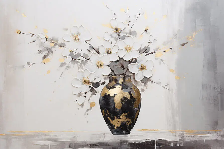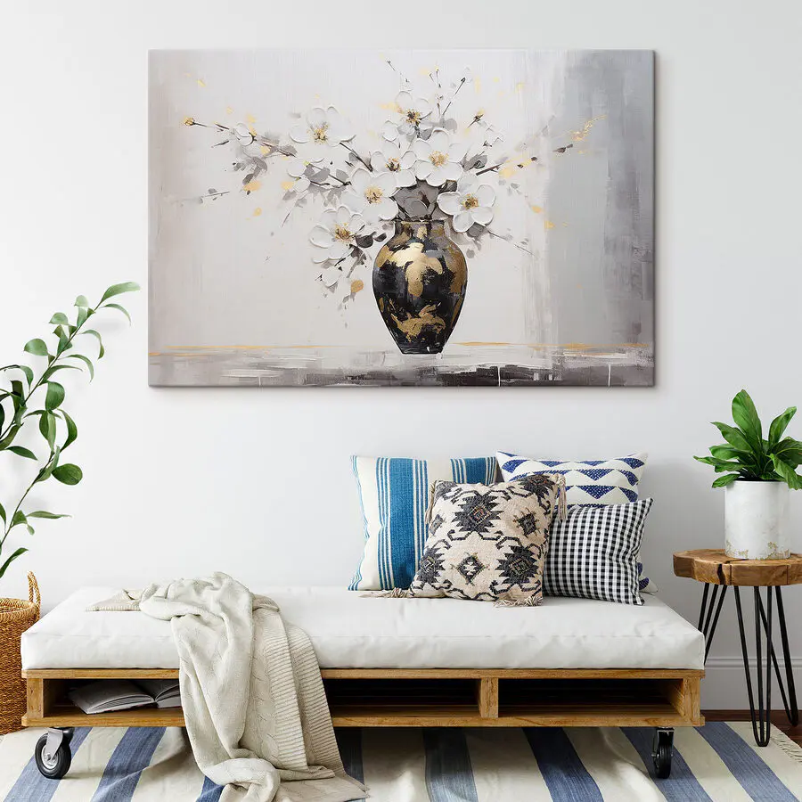 Rozjaśnij każde pomieszczenie tym czarującym wydrukiem na płótnie przedstawiającym kwiaty w wazonie. Wyobraź sobie to piękno zdobiące Twoją przestrzeń życiową, bez wysiłku dodające odrobinę koloru i uroku. Delikatne kwiaty wydają się tańczyć, a artystyczne zawirowania tworzą wrażenie ruchu i życia. Niezależnie od tego, czy jest to przytulny kącik do czytania, czy jadalnia, ten element zachęca do ciepła i rozmowy. Znajomi prawdopodobnie będą pytać, skąd pochodzi – bo kto nie chciałby podzielić się odrobiną kwiatowej magii? Idealny dla tych, którzy pragną odrobiny natury bez kłopotów z prawdziwymi kwiatami – nie wymaga podlewania!