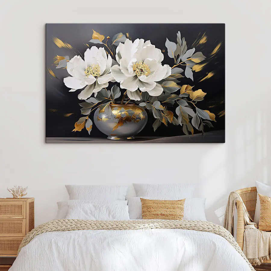 Odmień swoją przestrzeń dzięki temu wspaniałemu obrazowi na płótnie przedstawiającemu kwiaty w wazonie. Wyobraź sobie, że każdego dnia budzisz się z widokiem na te oszałamiające kwiaty – jak posiadanie świeżego bukietu bez podlewania i zmartwień! Delikatne kolory pięknie prezentują się na ciemnym tle, tworząc mały kącik radości w każdym pomieszczeniu. Idealny nad przytulnym kącikiem do czytania lub jako element dekoracyjny w salonie. To jak delikatny uścisk na ścianach, dodający ciepła i odrobiny natury, która po prostu dobrze się czuje. Ta sztuka sprawia, że każde spojrzenie jest nieco jaśniejsze – kto by tego nie chciał?