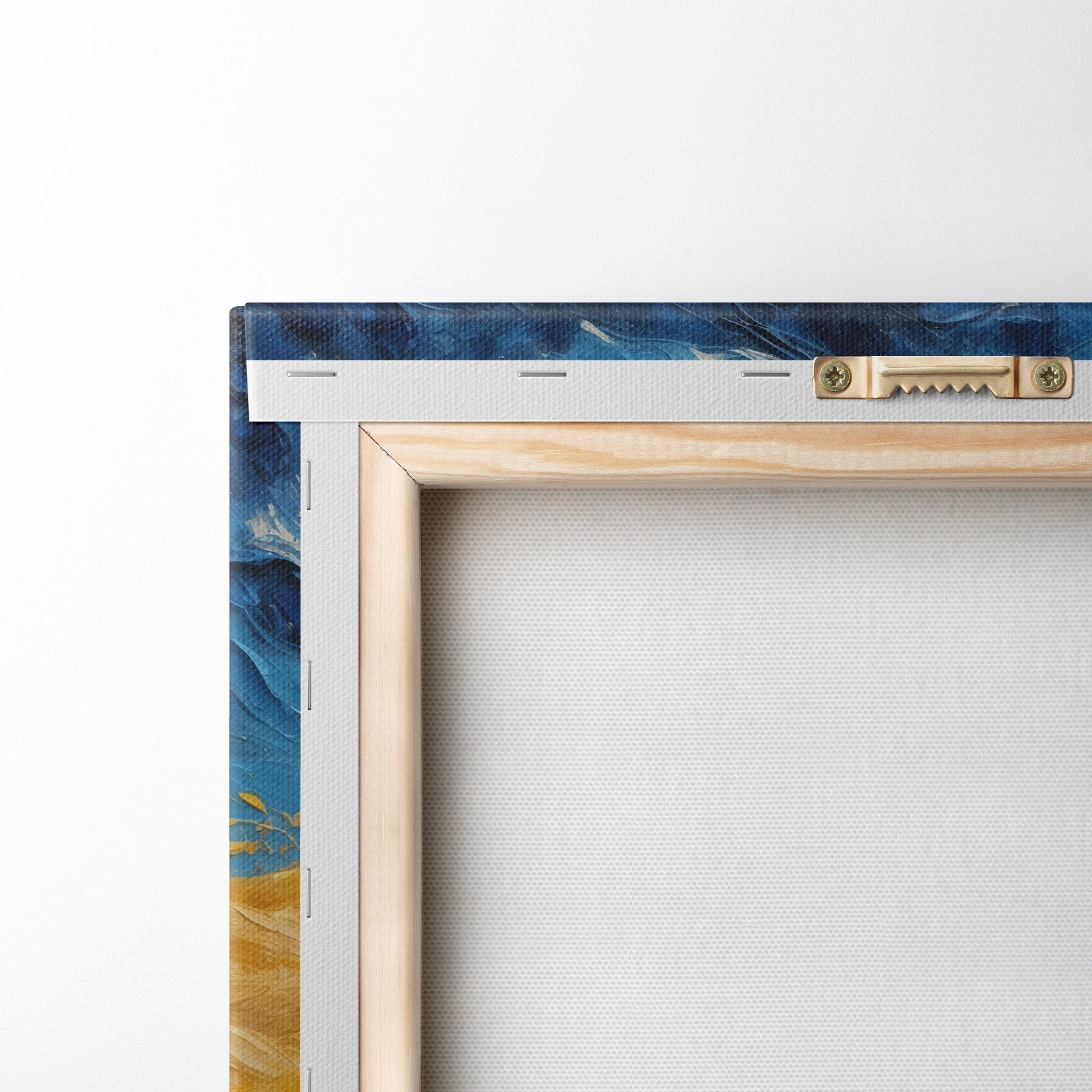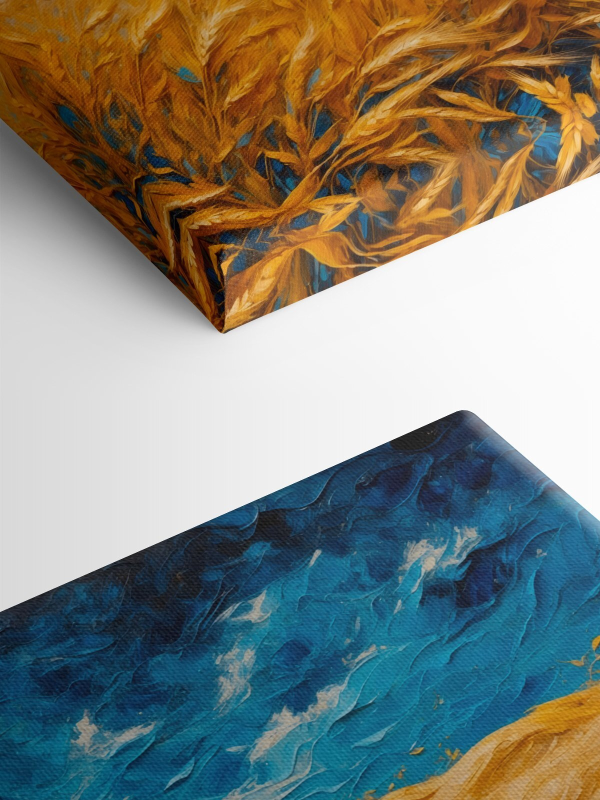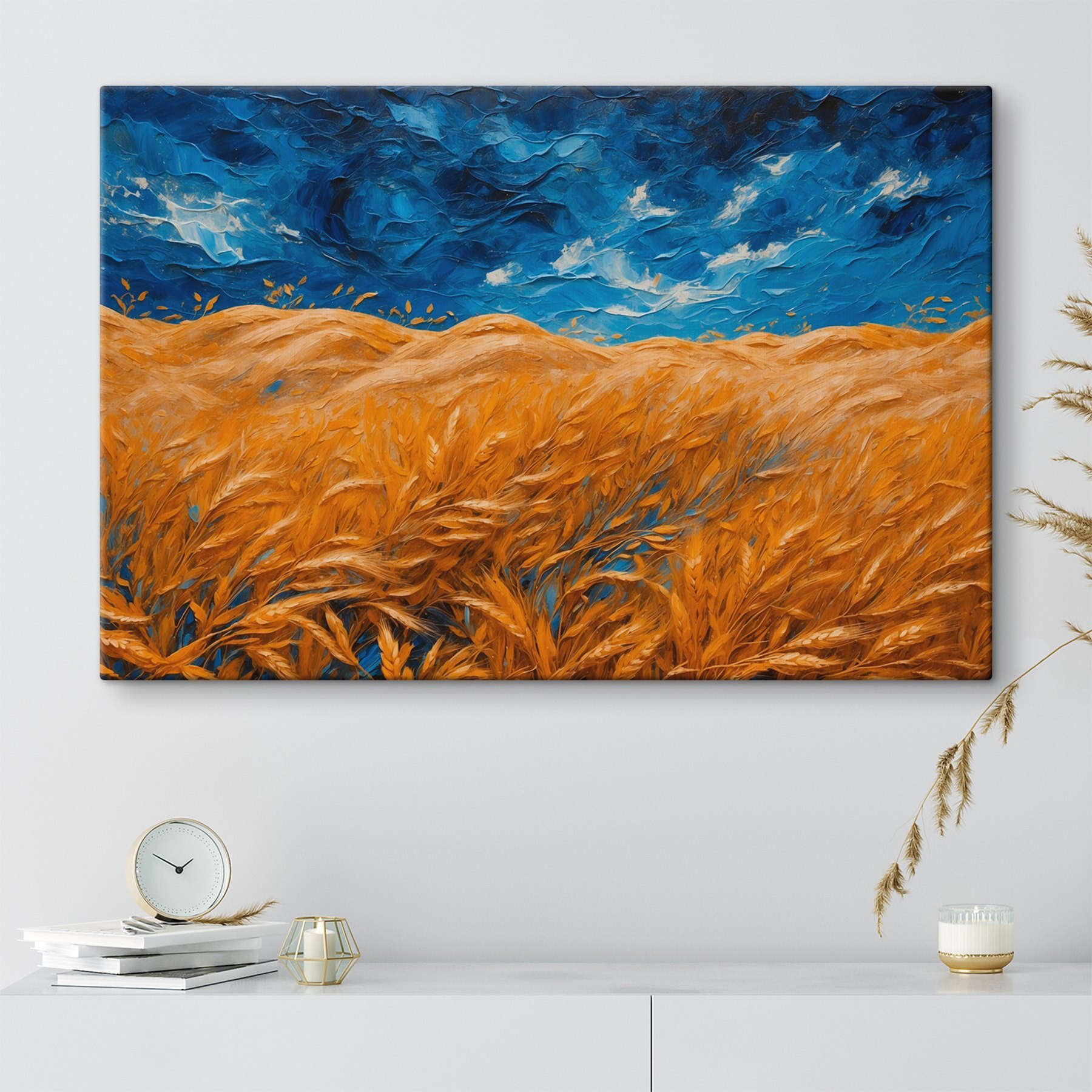 Wyobraź sobie, że wchodzisz do zalanego słońcem pokoju i wita Cię ten wydruk na płótnie przedstawiający złote pole pszenicy. Ten złoty odcień, z błękitnym niebem wirującym nad nim, sprawia, że wszystko wydaje się żywe. To jak przeniesienie się do wietrznego letniego dnia, w którym niemal słychać szelest pszenicy kołyszącej się na wietrze. Idealny do dodania ciepła do przytulnego zakątka, a nawet nudnego korytarza, który błaga o odrobinę osobowości. Ponadto przypomina o pięknie natury – nie wymaga podlewania. Niech ten element wniesie odrobinę radości do Twojej przestrzeni. Kto nie pokochałby odrobiny natury w swoim domu?