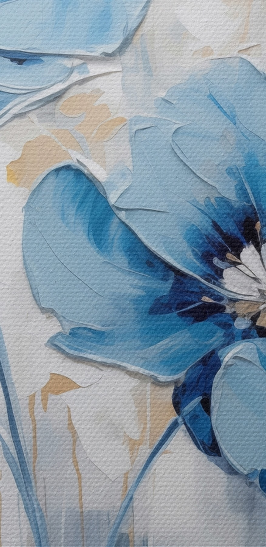 Odmień swoją przestrzeń dzięki temu wspaniałemu obrazowi na płótnie przedstawiającemu niebieskie kwiaty. Wyobraź sobie te żywe kwiaty tańczące na ścianie, wnoszące świeży, podnoszący na duchu nastrój do każdego pomieszczenia. Chłodne niebieskie odcienie są jak delikatna bryza w ciepły dzień – natychmiast uspokajają. Idealny do dodania odrobiny natury bez konieczności konserwacji! Wyobraź sobie przytulny kącik z wygodnym fotelem i dobrą książką, a może miejsce do popijania kawy podczas wpatrywania się w te piękności. To nie tylko sztuka; to mała ucieczka. Niech Twoje ściany rozkwitną osobowością, urokiem i odrobiną koloru!