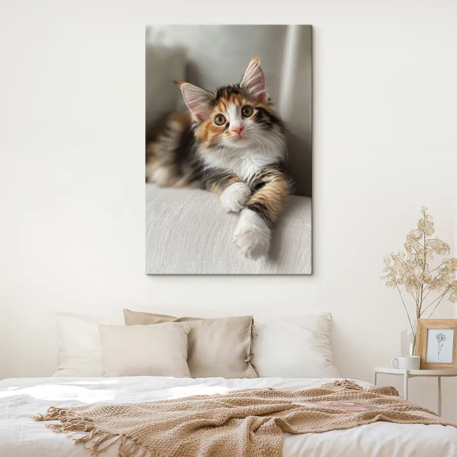 Poznaj najlepszego kumpla na swoje ściany: zabawny obraz na płótnie przedstawiający kota wylegującego się na kanapie. Ten mały futrzak jest uosobieniem przytulności – wyobraź sobie, jak rozjaśnia twój salon lub wywołuje uśmiech w twoim domowym biurze. Z jego uroczym pyszczkiem i puszystymi łapkami, to tak jakby mieć kawałek słodkości tuż obok, zachęcający do przytulnych wibracji.