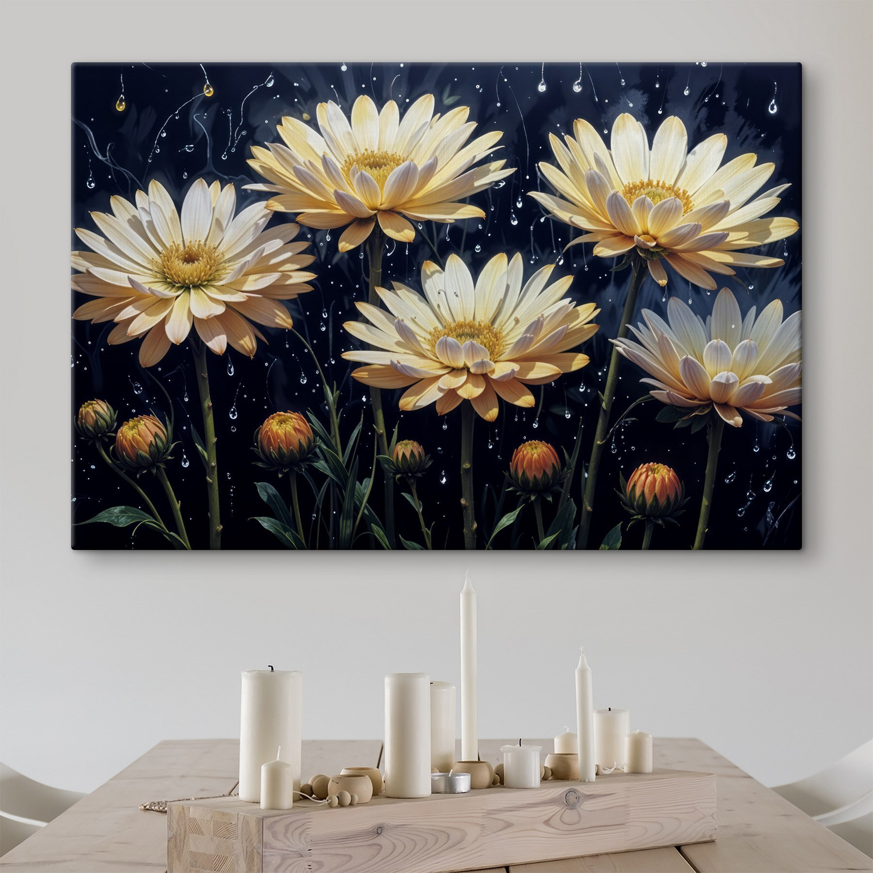 Rozjaśnij każde pomieszczenie dzięki temu oszałamiającemu obrazowi na płótnie “Grupa kwiatów z kroplami wody”. Wyobraź sobie przytulny poranek, światło słoneczne wpadające do środka, podczas gdy te żywe kwiaty rozpryskują kolor na ścianie. Bogate tekstury i delikatne krople wody tworzą świeży, żywy nastrój, jakbyś właśnie przyniósł kawałek ogrodu do domu. Idealny do salonu lub biura, gdzie nudnym ścianom przydałoby się trochę ożywienia. Wyobraź sobie, że popijasz kawę, spoglądasz na te piękności i czujesz natychmiastowe ożywienie. To nie tylko dekoracja; to doświadczenie czekające na rozkwit!