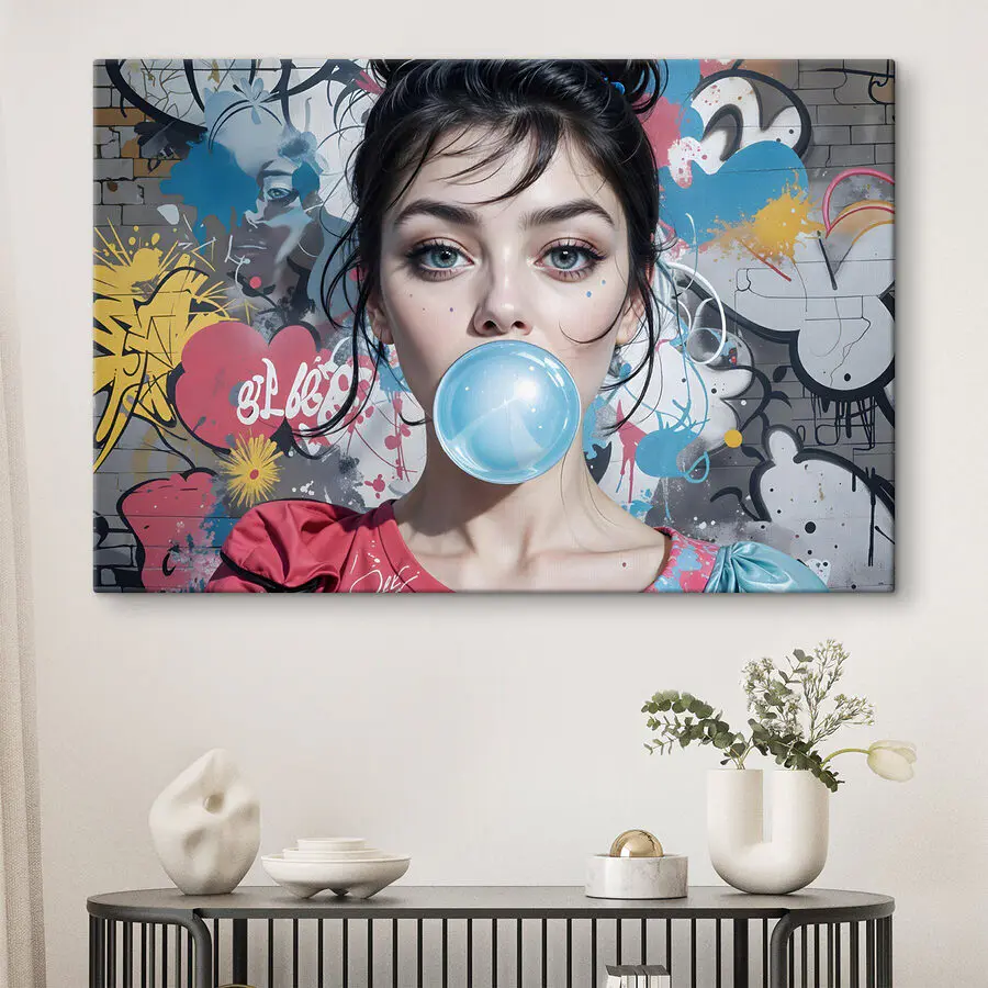 Dodaj odrobinę zabawy do każdego pomieszczenia dzięki temu żywemu drukowi na płótnie, przedstawiającemu fajną dziewczynę dmuchającą bańkę gumy balonowej tak dużą, jak jej marzenia. Umieszczony na pełnym kolorów tle graffiti, wnosi do wnętrza zabawny, uliczny klimat. Wyobraź sobie to dzieło wiszące w salonie, a może nawet w przytulnym kącie, w którym zbierają się przyjaciele – z pewnością wywoła rozmowy i uśmiechy. Ta sztuka szepcze o beztroskich dniach, przypominając nam o delektowaniu się małymi chwilami, takimi jak idealna bańka lub dobrze spędzony dzień. Idealny dla każdego, kto chce nadać swojemu wystrojowi osobowości.