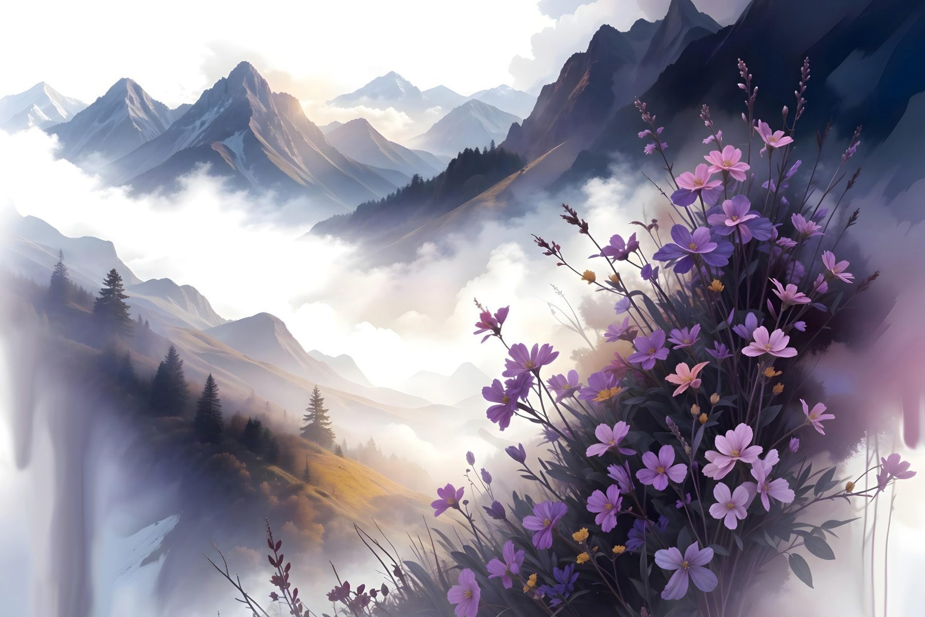 Odmień każdą przestrzeń dzięki temu oszałamiającemu drukowi na płótnie przedstawiającemu fioletowe kwiaty na tle majestatycznych gór. Wyobraź to sobie: wchodzisz do pokoju i bum, te żywe kwiaty przyciągają wzrok, wprowadzając do wnętrza powiew natury. Delikatne odcienie fioletu i zieleni po prostu śpiewają harmonijnie, sprawiając, że nawet najbardziej szare dni stają się nieco jaśniejsze. To jak posiadanie małego kawałka raju na ścianie, przywołującego łagodny spokój, który sprawi, że będziesz chciał odpocząć z filiżanką herbaty (lub kawy, jeśli to twój dżem). Idealny do salonu, sypialni lub dowolnego miejsca, które potrzebuje odrobiny piękna!