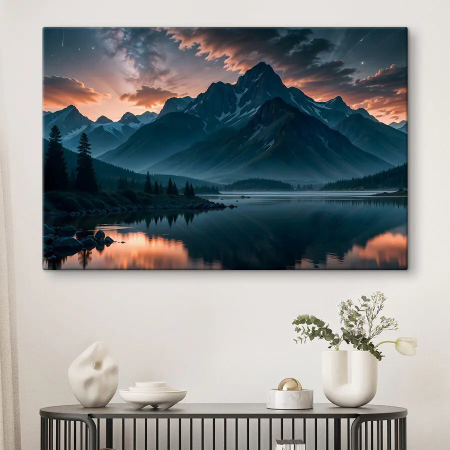 Wyobraź to sobie: spokojne jezioro odbijające majestatyczne góry, pocałowane delikatnym blaskiem zachodu słońca. Ten wydruk na płótnie to nie tylko sztuka; to chwila zamrożona w czasie, gotowa przenieść każdego, kto na nią spojrzy, na łono natury. Wyobraź sobie, że popijasz kawę, zatracając się w tych głębokich błękitach i ciepłych odcieniach. To tak, jakby mieć w domu kawałek natury, bez robaków i pogody. Dodatkowo, zachęca do rozmów! Goście będą zachwyceni jego pięknem, idealnym do wywołania efektu “wow” w salonie. Codzienne przypomnienie, że przygoda jest na wyciągnięcie ręki.