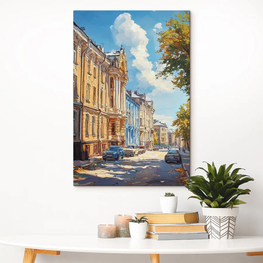 Ten żywy wydruk na płótnie, zatytułowany “Street with Cars Parked on It”, przedstawia słoneczny dzień w mieście, w którym urocza architektura spotyka się z codziennym życiem. Wyobraź sobie, że wpadasz w odcienie żółci i błękitu, czujesz się, jakbyś spacerował tą zachęcającą ulicą, być może marząc o historiach, które mogą opowiedzieć te zaparkowane samochody. Zabawne chmury nad głową i odrobina ciepłego światła słonecznego tworzą żywe tło, dodając odrobinę kaprysu do wystroju.