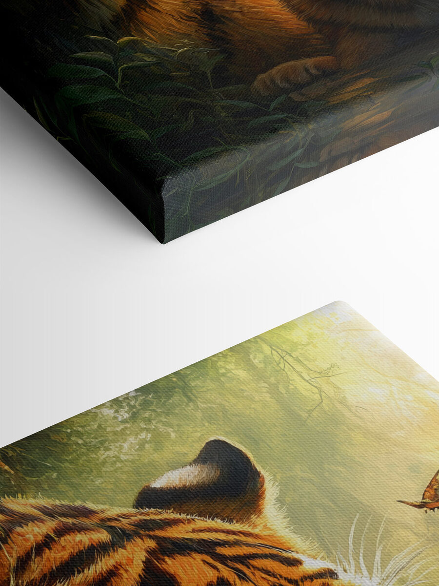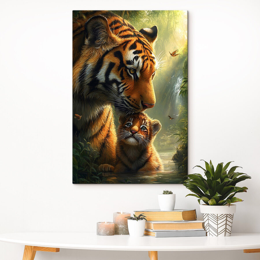 Zanurz się w dziczy dzięki temu oszałamiającemu drukowi na płótnie przedstawiającemu tygrysa i jego urocze młode, idealnie osadzone w bujnej dżungli. Spojrzenie tej małej puchatej kulki po prostu chwyta za serce, prawda? Wyobraź sobie, że to dzieło zdobi przytulny kącik, wywołując rozmowy, a może nawet kilka marzeń o safari i oświetlonych słońcem szlakach. Żywe kolory wprowadzają odrobinę natury do wnętrza, przypominając wszystkim o pięknie tuż za naszymi drzwiami. To tak, jakby mieć mały kawałek dzikiej przyrody w swoim domu! Idealny dla miłośników zwierząt lub każdego, kto chce dodać trochę zadziornego uroku do swojego wystroju. Poza tym, kto nie chciałby codziennej dawki słodkości?