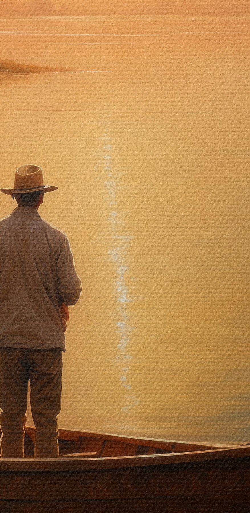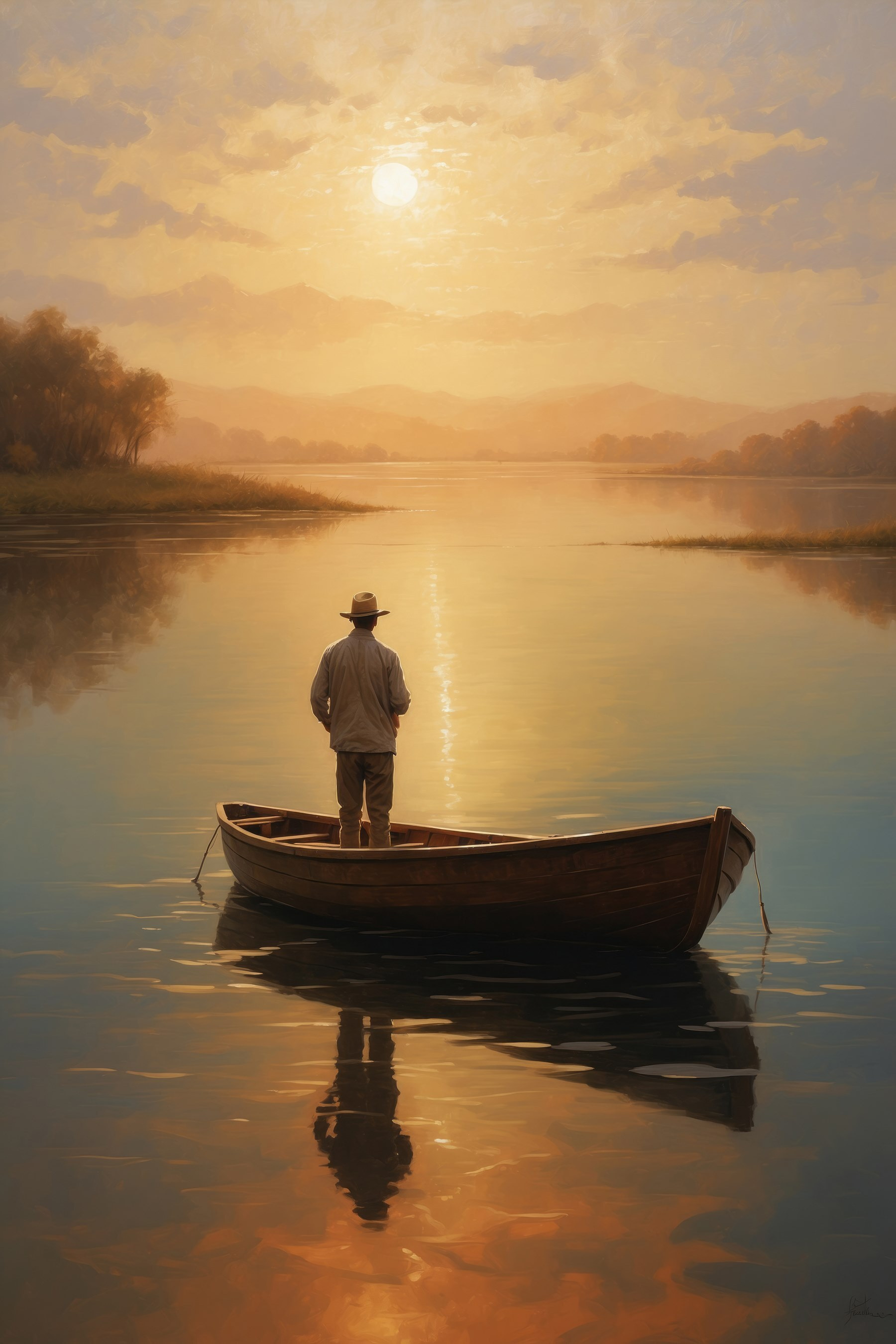 Wyobraź to sobie: spokojne jezioro o zachodzie słońca, gdzie samotna postać stoi w przytulnej łodzi, zagubiona w myślach, gdy dzień dobiega końca. Ten wydruk na płótnie pięknie oddaje ten spokojny moment. To nie tylko sztuka; to jak delikatny uścisk dla przestrzeni, która potrzebuje nieco więcej ciepła. Wyobraź sobie, że wisi w salonie, wywołując rozmowy o przygodach lub marzeniach. Szepcze do duszy, wywołując nostalgię za prostszymi czasami. Idealny dla miłośników natury lub każdego, kto chce dodać odrobinę spokoju do swojego wystroju. Wyobraź sobie, jak zwijasz się w kłębek z filiżanką herbaty, pozwalając tej scenie przenieść się na spokojne wody.