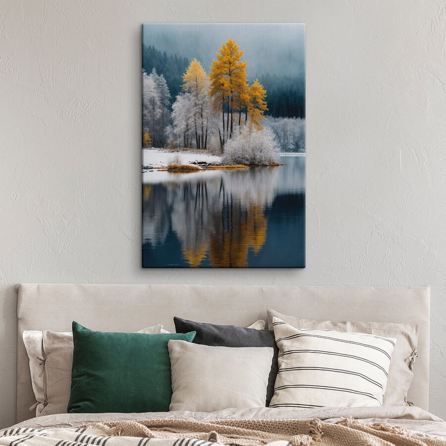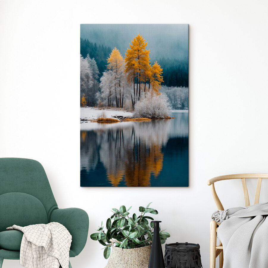 Przekształć dowolną ścianę w spokojną ucieczkę dzięki temu oszałamiającemu wydrukowi na płótnie. Wyobraź sobie, że wkraczasz do śnieżnej krainy czarów, z której wyłaniają się żywe drzewa, chwalące się złotymi odcieniami na chłodnym tle. Jest to widok, który sprawia, że chcesz wziąć przytulny koc i popijać coś ciepłego, wpatrując się w spokojne jezioro. Odwiedzający nie mogą powstrzymać się od poczucia spokoju. Idealny do salonu lub przytulnego kącika do czytania, ten obraz to nie tylko sztuka; to zaproszenie do marzeń i wędrówek. Każde spojrzenie przenosi kawałek natury prosto do domu.