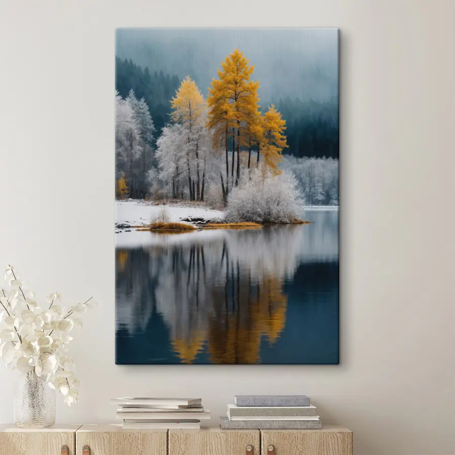 Przekształć dowolną ścianę w spokojną ucieczkę dzięki temu oszałamiającemu wydrukowi na płótnie. Wyobraź sobie, że wkraczasz do śnieżnej krainy czarów, z której wyłaniają się żywe drzewa, chwalące się złotymi odcieniami na chłodnym tle. Jest to widok, który sprawia, że chcesz wziąć przytulny koc i popijać coś ciepłego, wpatrując się w spokojne jezioro. Odwiedzający nie mogą powstrzymać się od poczucia spokoju. Idealny do salonu lub przytulnego kącika do czytania, ten obraz to nie tylko sztuka; to zaproszenie do marzeń i wędrówek. Każde spojrzenie przenosi kawałek natury prosto do domu.