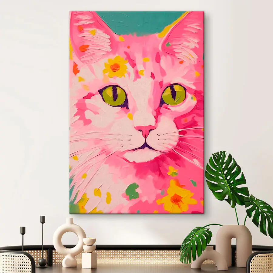 Rozjaśnij każde pomieszczenie dzięki temu wspaniałemu drukowi na płótnie przedstawiającemu uroczego kota ozdobionego wesołymi kwiatami. Jego żywe kolory i zabawny design wprowadzają ciepłą, zachęcającą atmosferę, idealną zarówno dla miłośników kotów, jak i entuzjastów przyrody. Wyobraź sobie to dzieło wiszące w przytulnym kąciku do czytania, gdzie łapie światło słoneczne w sam raz – tworząc kolorowy plusk, który wywołuje uśmiech za każdym razem, gdy go widzisz. To jak posiadanie dziwacznego przyjaciela, który po prostu nie może przestać kwitnąć! Ta sztuka dodaje osobowości i odrobiny zabawy, dzięki czemu jest obowiązkowa dla każdego entuzjasty wyjątkowych dekoracji. Praktycznie usłyszysz chichot kwiatów!