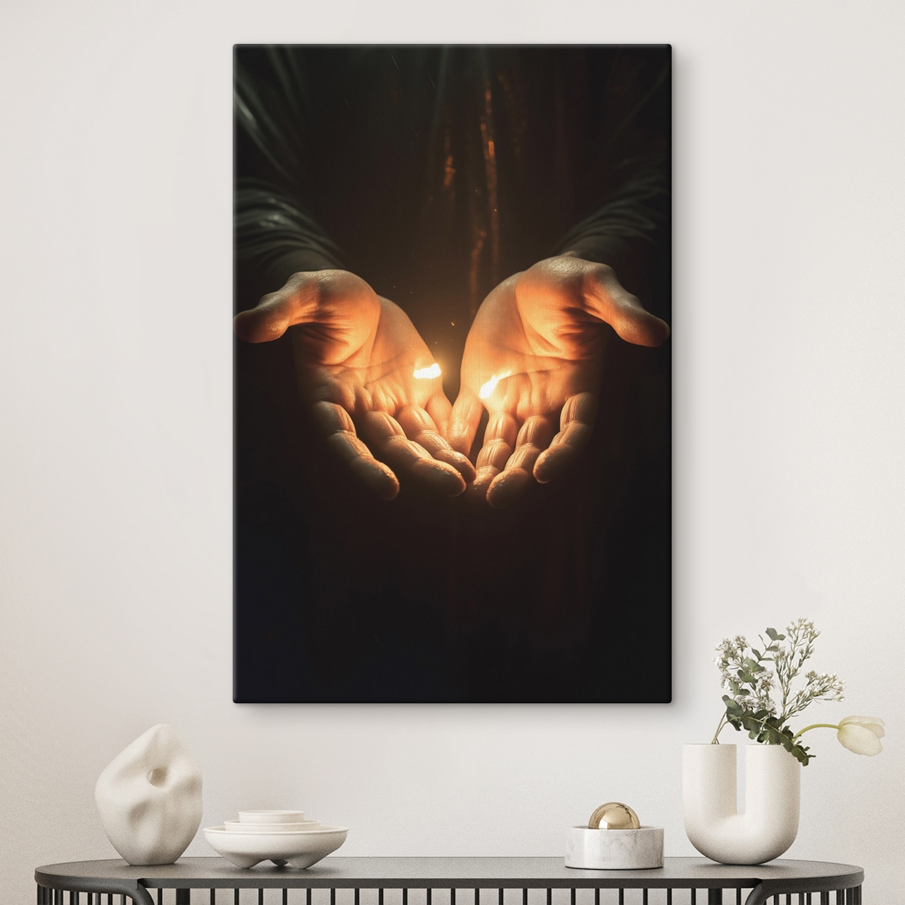 Wkrocz do świata, w którym dłonie kołyszą migoczące światło, tworząc przytulną, niemal magiczną atmosferę. Ten wydruk na płótnie to nie tylko dzieło sztuki; to zaproszenie do zatrzymania się i refleksji, do oddychania ciepłem. Wyobraź sobie, że wisi w słabo oświetlonym pokoju, rzucając miękkie cienie i wywołując rozmowy na temat więzi i troski. Jest idealny dla każdego, kto lubi odrobinę inspiracji w swojej przestrzeni. Może przywołuje wspomnienia obserwacji gwiazd w pogodną noc lub prostą radość dzielenia się ciepłą filiżanką z przyjacielem. Unikalny element, który otuli Twój dom delikatnym uściskiem, sprawiając, że każda chwila będzie odrobinę jaśniejsza.