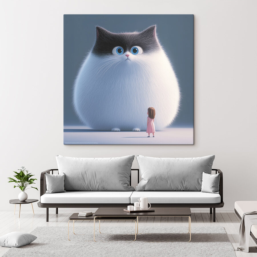 Wyobraź sobie zabawną scenę, w której mała dziewczynka wpatruje się w niemożliwie puszystego kota z oczami wielkimi jak spodki. Ten wydruk na płótnie to nie tylko sztuka; to kawałek kaprysu, który może wywołać uśmiech na twarzy każdego. Wygląda na to, że kot ma tajemnice, którymi chce się podzielić, a ta mała dziewczynka po prostu chce je poznać! Idealny do przytulnego kącika lub pokoju dziecięcego, pobudza wyobraźnię i śmiech. Odwiedzający mogą zatrzymać się, zachichotać i powiedzieć: “Czy to nie urocze?”. To delikatne przypomnienie, że czasami największe radości życia przychodzą w najbardziej puszystych opakowaniach.